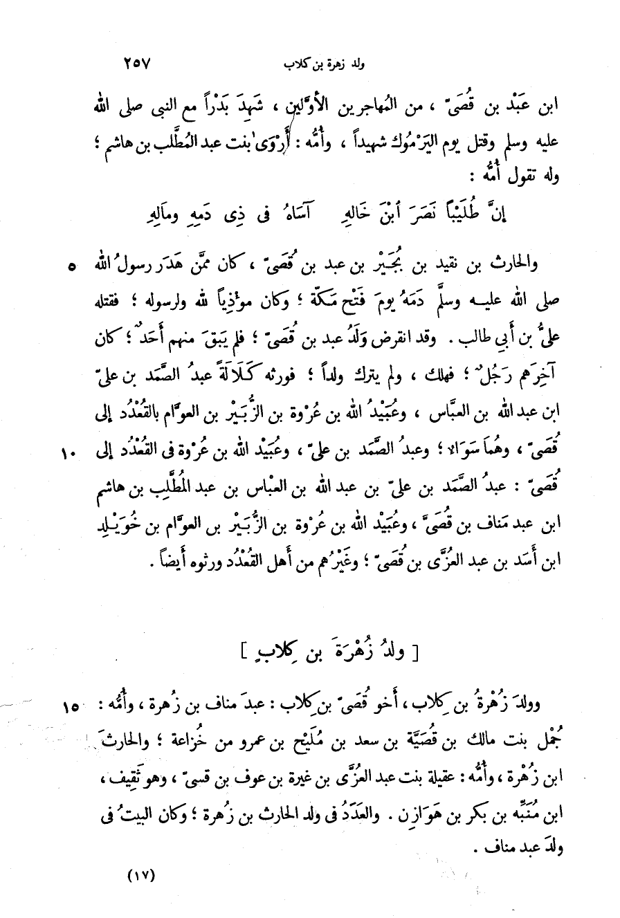 وولد زهرة بن كلاب، أخو قصي بن كلاب: عبد مناف بن زهرة، وأمه: جمل بنت مالك بن قصية بن سعد بن مليح بن عمرو من خزاعة؛ والحارث بن زهرة، وأمه: عقيلة بنت عبد العزى بن غيرة بن عوف بن قسي، وهو ثقيف، بن منبه بن بكر بن هوازن. والعدد في ولد الحارث بن زهرة؛ وكان البيت في ولد عبد مناف.