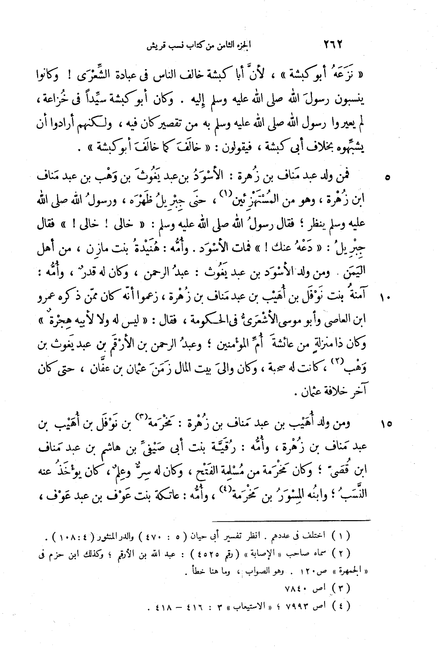 فمن ولد عبد مناف بن زهرة: الأسود بن عبد يغوث بن وهب بن عبد مناف بن زهرة، وهو من المستهزئين، حنى جبريل ظهره، ورسول الله صَلَّى اللهُ عَلَيْهِ وَسَلَّمَ ينظر؛ فقال رسول الله صَلَّى اللهُ عَلَيْهِ وَسَلَّمَ: " خالى! خالي! " فقال جبريل: " دعه عنك! " فمات الأسود. وأمه: هنيدة بنت مازن، من أهل اليمن. ومن ولد الأسود بن عبد يغوث: عبد الرحمن، وكان له قدر، وأمه: آمنة بنت نوفل بن أهيب بن عبد مناف بن زهرة، زعموا أنه كان ممن ذكره عمرو بن العاصي وأبو موسى الأشعري في الحكومة، فقال: " ليس له ولا لأبيه هجرة " وكان ذا منزلة من عائشة أم المؤمنين؛ وعبد الرحمن بن الأرقم بن عبد يغوث بن وهب، كانت له صحبة، وكان والي بيت المال زمن عثمان بن عفان، حتى كان آخر خلافة عثمان.