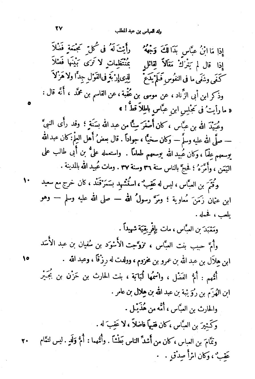 وذكر ابن أبي الزناد، عن موسى بن عقبة، عن القاسم بن محمد، أنه قال: " ما رأيت في مجلس ابن عباس باطلاً قط! " وعبيد الله بن عباس، كان أصغر سناً من عبد الله بسنة؛ وقد رأى النبي - صَلَّى اللهُ عَلَيْهِ وَسَلَّمَ - وكان سخياً، جواداً. قال بعض أهل العلم: كان عبد الله يوسعهم علماً، وكان عبيد الله يوسعهم طعاماً. واستعمله علي بن أبي طالب على اليمن، وأمره؛ فحج بالناس سنة 36 وسنة 37. ومات عبيد الله بالمدينة.