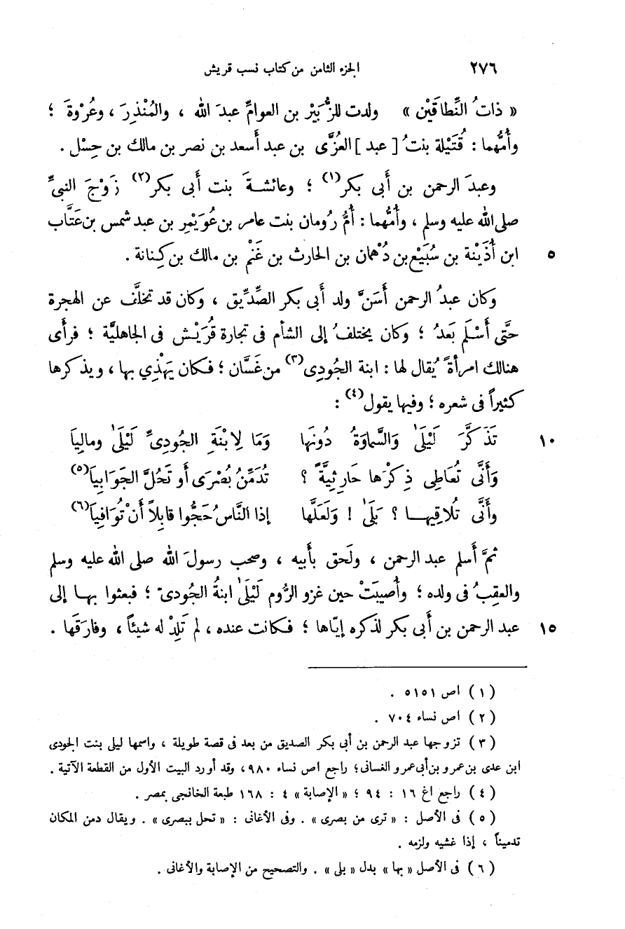 ثم أسلم عبد الرحمن، ولحق بأبيه، وصحب رسول الله صَلَّى اللهُ عَلَيْهِ وَسَلَّمَ والعقب في ولده؛ وأصيبت حين غزوة الروم ليلى ابنة الجودي؛ فبعثوا بها إلى عبد الرحمن بن أبي بكر لذكره إياها؛ فكانت عنده، لم تلد له شيئاً، وفارقها.