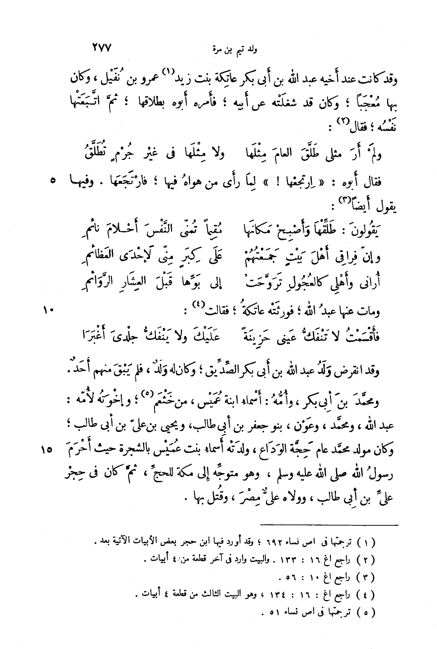 وقد كانت عند أخيه عبد الله بن أبي بكر عاتكة بنت زيد عمرو بن نفيل، وكان بها معجباً؛ وكان قد شغلته عن أبيه؛ فأمره أبوه بطلاقها؛ قم اتبعتها نفسه؛ فقال: