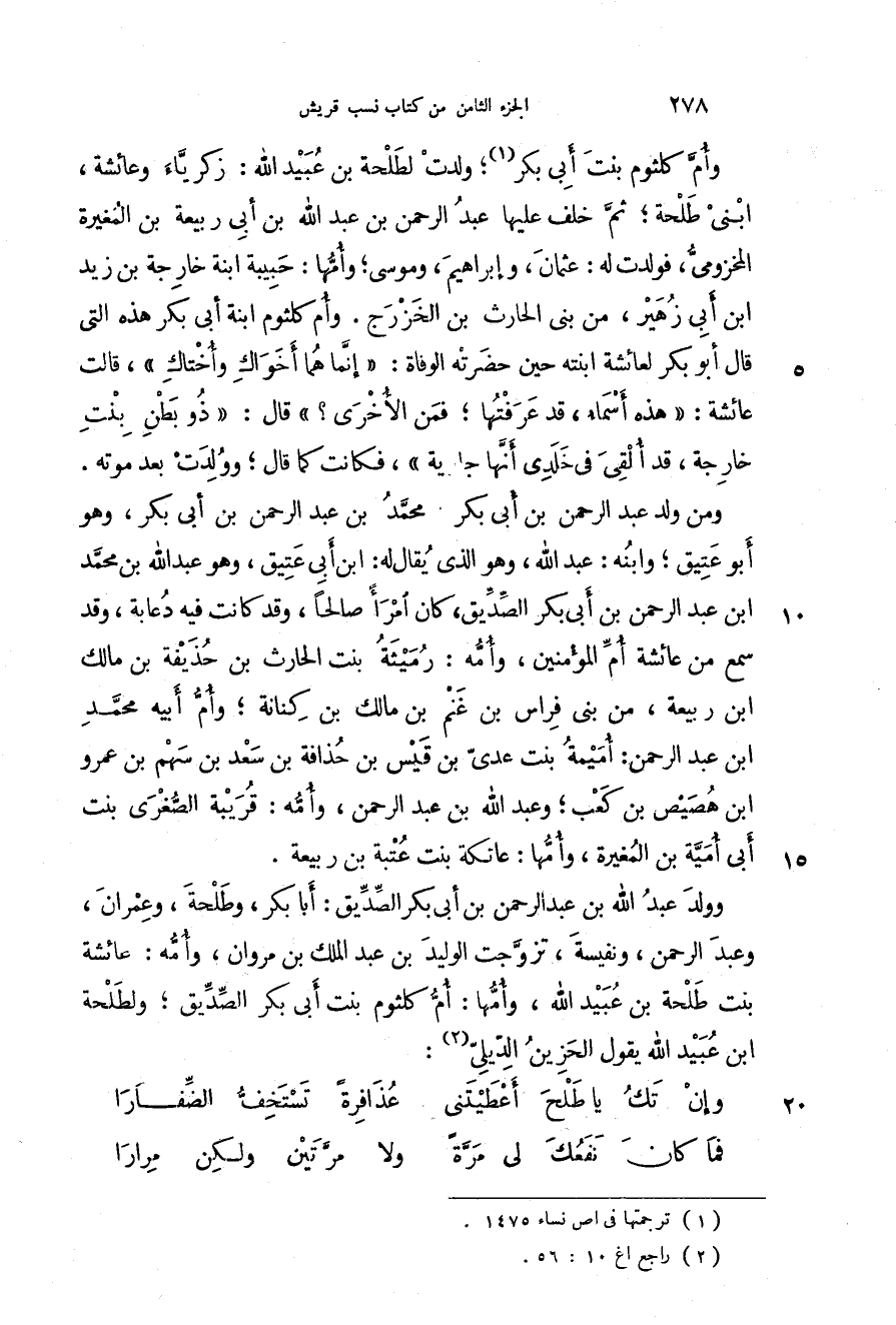 وأم كلثوم بنت أبي بكر؛ ولدت لطلحة بن عبيد الله: زكرياء وعائشة، ابني طلحة؛ ثم خلف عليها عبد الرحمن بن عبد الله بن أبي ربيعة بن المغيرة المخزومي، فولدت له: عثمان، وإبراهيم، وموسى؛ وأمها: حبيبة ابنة خارجة بن زيد بن أبي زهير، من بني الحارث بن الخزرج. وأم كلثوم ابنة أبي بكر هذه التي قال أبو بكر لعائشة ابنته حين حضرته الوفاة: " إنما هما أخواك وأختاك "، قالت عائشة: " هذه أسماء، قد عرفتها؛ فمن الأخرى؟ " قال: " ذو بطن بنت خارجة، قد ألقي في خلدي أنها جارية "، فكانت كما قال؛ وولدت بعد موته.