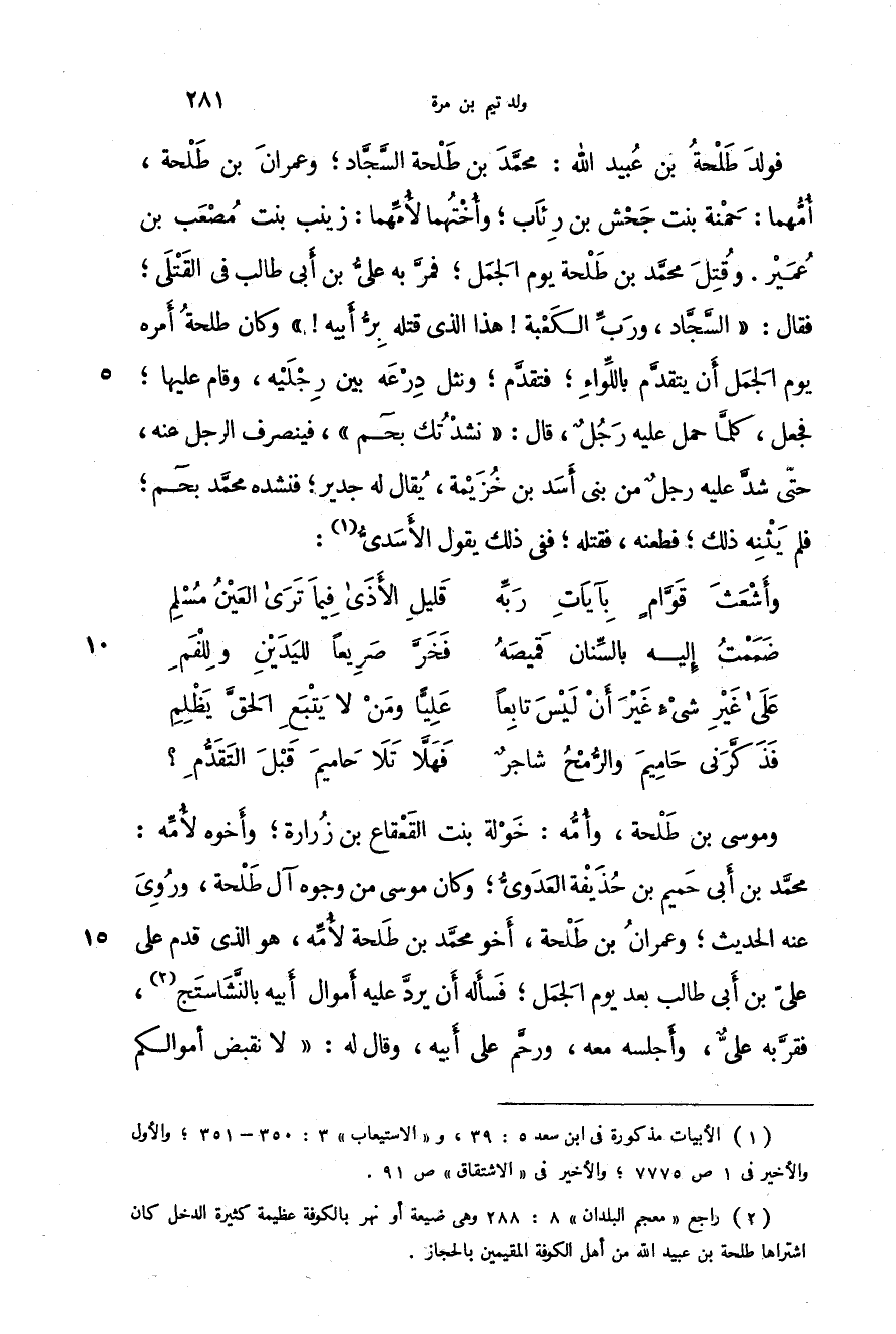 فولد طلحة بن عبيد الله: محمد بن طلحة السجاد؛ وعمران بن طلحة، أمهما: حمنة بنت جحش بن رئاب؛ وأختهما لأمهما: زينب بنت مصعب بن عمير. وقتل محمد بن طلحة يوم الجمل؛ فمر به علي بن أبي طالب في القتلى؛ فقال: " السجاد، ورب الكعبة! هذا الذي قتله بر أبيه! " وكان طلحة أمره يوم الجمل أن يتقدم باللواء؛ فتقدم؛ ونثل درعه بين رجليه، وقام عليها؛ فجعل، كلما حمل عليه رجل، قال: " نشدتك بحم "، فينصرف الرجل عنه، حتى شد عليه رجل من بني أسد بن خزيمة، يقال له جدير؛ فنشده محمد بحم؛ فلم يثنه ذلك؛ فطعنه، فقتله ففي ذلك يقول الأسدي: