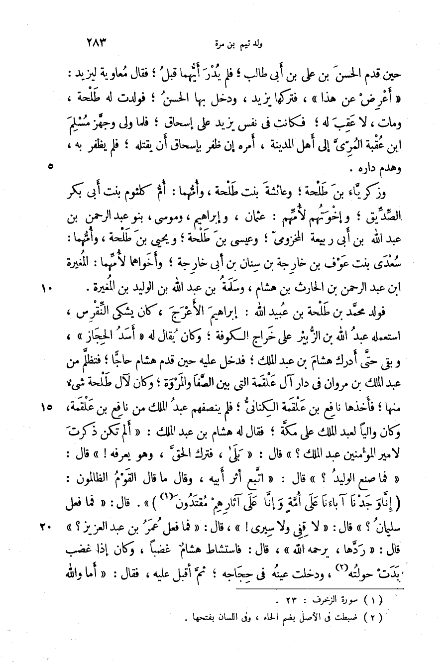 فولد محمد بن طلحة بن عبيد الله: إبراهيم الأعرج، كان يشكي النقرس، استعمله عبد الله بن الزبير على خراج الكوفة؛ وكان يقال له " أسد الحجاز "، وبقي حتى أدرك هشام بن عبد الملك؛ فدخل عليه حين قدم هشام حاجاً؛ فتظلم من عبد الملك بن مروان في دار آل علقمة التي بين الصفا والمروة؛ وكان لآل طلحة شيء منها؛ فأخذها نافع بن علقمة الكناني؛ فلم ينصفهم عبد الملك من نافع بن علقمة، وكان والياً لعبد الملك على مكة؛ فقال له هشام بن عبد الملك: " ألم تكن ذكرت لأمير المؤمنين عبد الملك؟ قال: " بلى، فترك الحق، وهو يعرفه! " قال: " فما صنع الوليد؟ " قال: " اتبع أثر أبيه، وقال ما قال القوم الظالمون: " إنا وجدنا آباءنا على أمة وإنا على آثارهم مقتدون ". قال: " فما فعل سليمان؟ " قال: " لا قفي ولا سيري! "، قال: " فما فعل عمر بن عبد العزيز؟ " قال: " ردها، يرحمه الله "، قال: فاستشاط هشام غضباً، وكان إذا غضب بدلت حولته، ودخلت عينه في حجاجه؛ ثم أقبل عليه، فقال: " أما والله