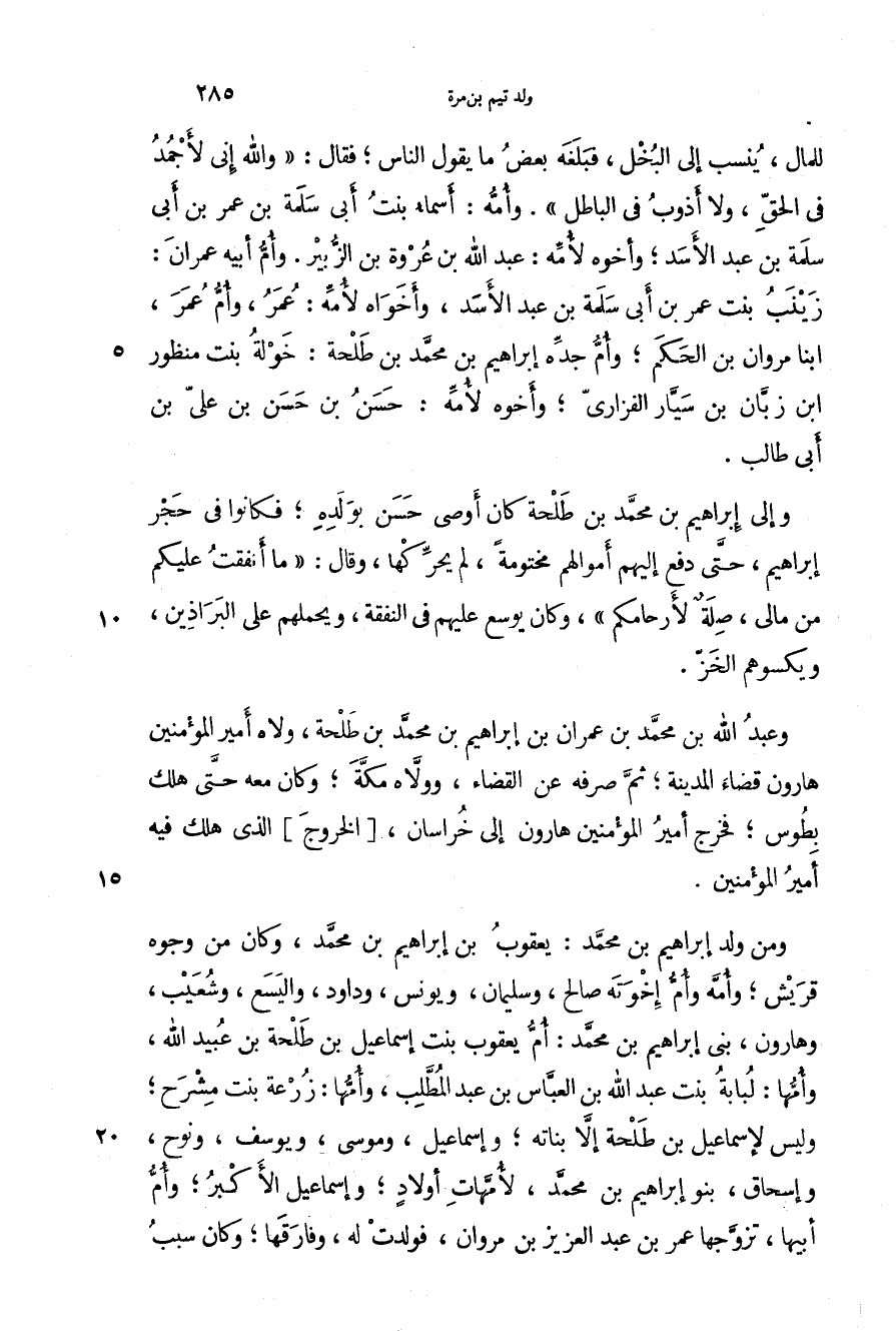 وعبد الله بن محمد بن عمران بن إبراهيم بن محمد بن طلحة، ولاه أمير المؤمنين هارون قضاء المدينة؛ ثم صرفه عن القضاء، وولاه مكة؛ وكان معه حتى هلك بطوس؛ فخرج أمير المؤمنين هارون إلى خراسان، الخروج الذي هلك فيه أمير المؤمنين.