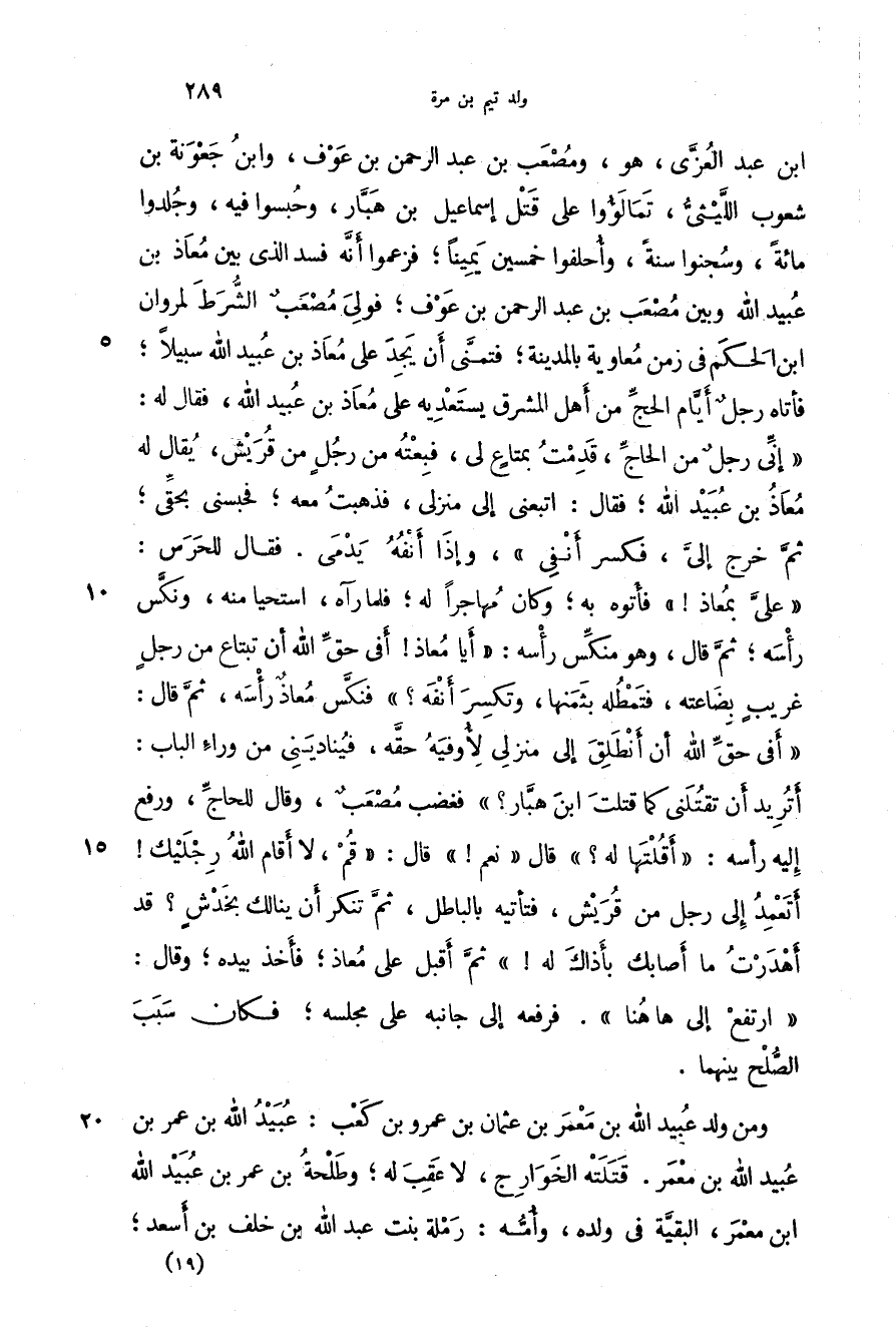 بن عبد العزى، هو، ومصعب بن عبد الرحمن بن عوف، وابن جعونة بن شعوب الليثي، تمالؤوا على قتل إسماعيل بن هبار، وحبسوا فيه، وجلدوا مائة، وسجنوا سنة، وأحلفوا خمسين يميناً؛ فزعموا أنه فسد الذي بين معاذ بن عبيد الله وبين مصعب بن عبد الرحمن بن عوف؛ فولى مصعب الشرط لمروان بن الحكم في زمن معاوية بالمدينة؛ فتمنى أن يجد على معاذ بن عبيد الله سبيلاً؛ فأتاه رجل أيام الحج من أهل المشرق يستعديه على معاذ بن عبيد الله، فقال له: " إني رجل من الحاج، قدمت بمتاع لي، فبعته من رجل من قريش، يقال له معاذ بن عبيد الله؛ فقال: اتبعني إلى منزلي، فذهبت معه؛ فحبسني بحقي؛ ثم خرج إلي، فكسر أنفي "، وإذا أنفه يدمي. فقال للحرس: " علي بمعاذ! " فأتوه به؛ وكان مهاجراً له؛ فلما رآه، استحيا منه، ونكس رأسه؛ ثم قال، وهو منكس رأسه: " أيا معاذ! أفي حق الله أن تبتاع من رجل غريب بضاعته، فتمطله بثمنها، وتكسر أنفه؟ " فنكس معاذ رأسه، ثم قال: " أفي حق الله أن أنطلق إلى منزلي لأوفيه حقه، فيناديني من وراء الباب: أتريد أن تقتلني كما قتلت ابن هبار؟ " فغضب مصعب، وقال للحاج، ورفع إليه رأسه: " أقلتها له؟ " قال " نعم! " قال: " قم، لا أقام الله رجليك! أتعمد إلى رجل من قريش، فتأتيه بالباطل، ثم تنكر أن ينالك بخدش؟ قد أهدرت ما أصابك بأذاك له! " ثم أقبل على معاذ؛ فأخذ بيديه؛ وقال: " ارتفع إلى ها هنا ". فرفعه إلى جانبه على مجلسه؛ فكان سبب الصلح بينهما.