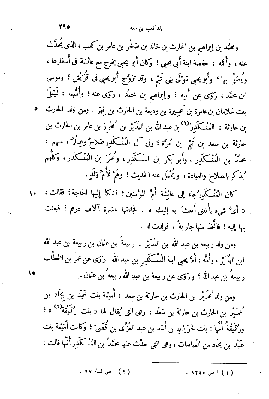 ومحمد بن إبراهيم بن الحارث بن خالد بن صخر بن عامر بن كعب، الذي يحدث عنه، وأمه: حفصة ابنة أبي يحيى، وكان أبو يحيى يخرج مع عائشة في أسفارها ويعلي بها، وأبو يحيى مولى بن تيم، وقد تزوج أبو يحيى في قريش؛ وموسى بن محمد، روى عن أبيه؛ وإبراهيم بن محمد، روى عنه؛ وأمهما: ليلى بنت سلامان بن عامرة بن عميرة بن وديعة بن الحارث بن فهر. ومن ولد الحارث بن حارثة: المنكدر بن عبد الله بن الهدير بن محرز بن عامر بن الحارث بن حارثة بن سعد بن تيم بن مرة؛ وفي آل المنكدر صلاح وعلم، منهم: محمد بن المنكدر، وأبو بكر بن المنكدر، وعمر بن المنكدر، وكلهم يذكر بالصلاح والعبادة، ويحمل عنه الحديث؛ وهم لأم ولد.
