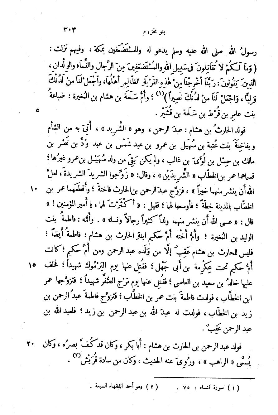 فولد الحارث بن هشام: عبد الرحمن، وهو " الشريد "، أتي به من الشأم وبفاختة بنت عتبة بن سهيل بن عمرو بن عبد شمس بن عبد ود بن نصر بن مالك بن حسل بن لؤي بن غالب، ولم يكن بقي من ولد سهيل بن عمرو غيرها؛ فسماهما عمر بن الخطاب " الشريدين "، وقال: " زوجوا الشريد الشريدة، لعل الله أن ينشر منهما خيراً "، فزوج عبد الرحمن بن الحارث فاختة؛ وأقطعهما عمر بن الخطاب بالمدينة خطة؛ فأوسعها لهما؛ فقيل: " أكثرت لهما، يا أمير المؤمنين! " قال: " عسى الله أن ينشر منهما ولداً كثيراً رجالاً ونساءً ". وأمه: فاطمة بنت الوليد ابن المغيرة؛ وأم فاختة أم حكيم ابنة الحارث بن هشام: فاطمة أيضاً؛ فليس للحارث بن هشام عقب إلا من ولده عبد الرحمن ومن أم حكيم؛ كانت أم حكيم تحت عكرمة بن أبي جهل؛ فقتل عنها يوم اليرموك شهيداً؛ فخلف عليها خالد بن سعيد بن العاصي؛ فقتل عنها يوم مرج الصفر شهيداً؛ فتزوجها عمر بن الخطاب، فولدت فاطمة بنت عمر بن الخطاب؛ فتزوج فاطمة عبد الرحمن بن زيد بن الخطاب، فولدت له عبد الله بن عبد الرحمن بن زيد؛ فلعبد الله بن عبد الرحمن عقب.