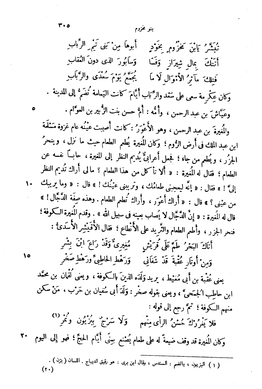 والمغيرة بن عبد الرحمن، وهو الأعور: كانت أصيبت عينه عام غزوة مسلمة بن عبد الملك في أرض الروم؛ وكان المغيرة يطعم الطعام حيث ما نزل، وينحر الجزر، ويطعم من جاء؛ فجعل أعرابي يديم النظر إلى المغيرة، حابساً نفسه عن الطعام؛ فقال له المغيرة: " ألا تأكل من هذا الطعام؟ مالي أراك تديم النظر إلي! " فقال: " إنه ليعجبني طعامك، وتريبني عينك! " قال: " وما يريبك من عيني؟ " قال: " أراك أعور، وأراك تطعم الطعام. وهذه صفة الدجال! " قال له المغيرة: " إن الدجال لا يصاب بعينه في سبيل الله ". وقدم المغيرة الكوفة؛ فنحر الجزر، وأطعم الطعام والثريد على الأنطاع؛ فقال الأقيشر الأسدي: