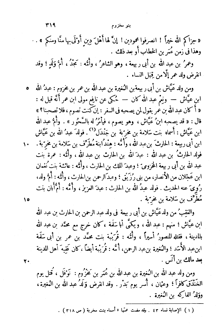 ومن ولد عياش - ونعم عبد الله كان - حكي عن نافع مولى ابن عمر أنه قيل له: " أكان عبد الله بن عمر يقول لمن يصحبه في السفر: إن كنت تصوم، فلا تصحبنا؟ " قال: " قد يصحبه ابن عياش، وهو يصوم، فيأمر له بالسحور ". وأم عبد الله بن عياش: أسماء بنت سلامة بن مخربة بن جندل. فولد عبد الله بن عياش بن أبي ربيعة: الحارث بن عبد الله، وأمه: هند ابنة مطرف بن سلامة بن مخربة. فولد الحارث بن عبد الله: عبد الله بن الحارث بن عبد الله، وأمه: عمرة بنت عبد الله بن أبي ربيعة المخزومي؛ وعبد الملك بن الحارث، وأمه: عائشة بنت نعمان بن عجلان من الأنصارن من بني زريق؛ وعبد الرحمن بن الحارث، وأمه: أم ولد، روي عنه الحديث. فولد عبد الله بن الحارث: عبد العزيز، وأمه: أم أبان بنت مطرف بن سلامة بن مخربة.