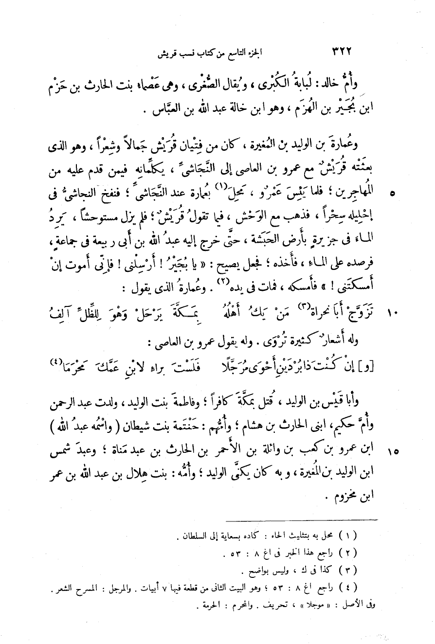 وعمارة بن الوليد بن المغيرة، كان فتيان قريش جمالاً وشعراً، وهو لذي بعثته قريش مع عمرو بن العاصي إلى النجاشي، يكلمانه فيمن قدم عليه من المهاجرين؛ فلما يئس عمرو، محل بعمارة عند النجاشي؛ فنفخ النجاشي في أحليله سحراً، فذهب مع الوحش، فيما تقول قريش؛ فلم يزل مستوحشاً، يرد الماء في جزيرة بأرض الحبشة، حتى خرج إليه عبد الله بن أبي ربيعة في جماعة، فرصده على الماء، فأخذه؛ فجعل يصيح: " يا بجير! أرسلني! فإني أموت إن أمسكتني! " فأمسكه، فمات في يده. وعمارة الذي يقول: