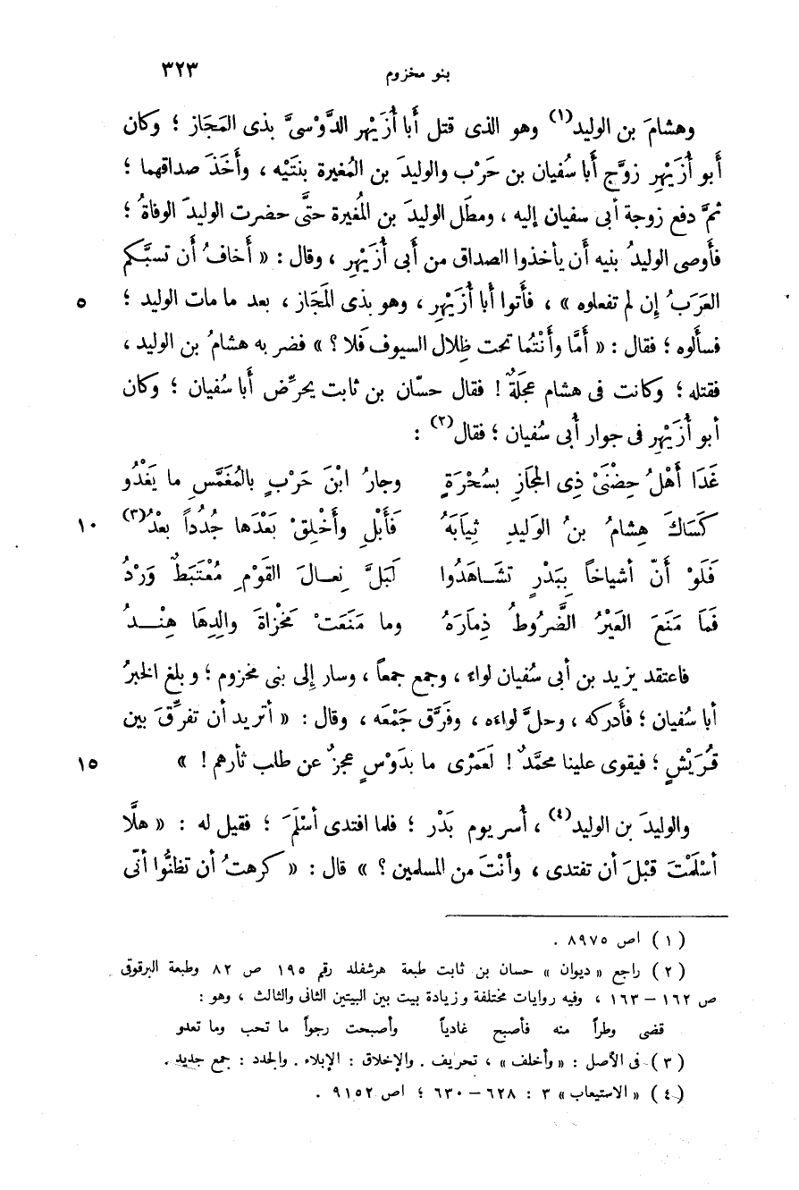 وهشام بن الوليد وهو الذي قتل أبا أزيهر الدوسي بذي المجاز؛ وكان أبو أزيهر زوج أبا سفيان بن حرب والوليد بن المغيرة بنتيه، وأخذ صداقهما؛ ثم دفع زوجة أبي سفيان إليه، ومطل الوليد بن المغيرة حتى حضرت الوليد الوفاة؛ فأوصى الوليد بنيه أن يأخذوا الصداق من أبي أزيهر، وقال: أخاف أن تسبكم العرب أن لم تفعلوه، فأتى أبا أزيهر وهو بذي المجاز، بعد ما مات الوليد؛ فسألوه؛ فقال: " أما وأنتما تحت ظلال السيوف فلا؟ " فضربه هشام بن الوليد، فقتله؛ وكانت في هشام عجلة! فقال حسان بن ثابت يحرض أبا سفيان؛ وكان أبو أزيهر في جوار أبي سفيان؛ فقال: