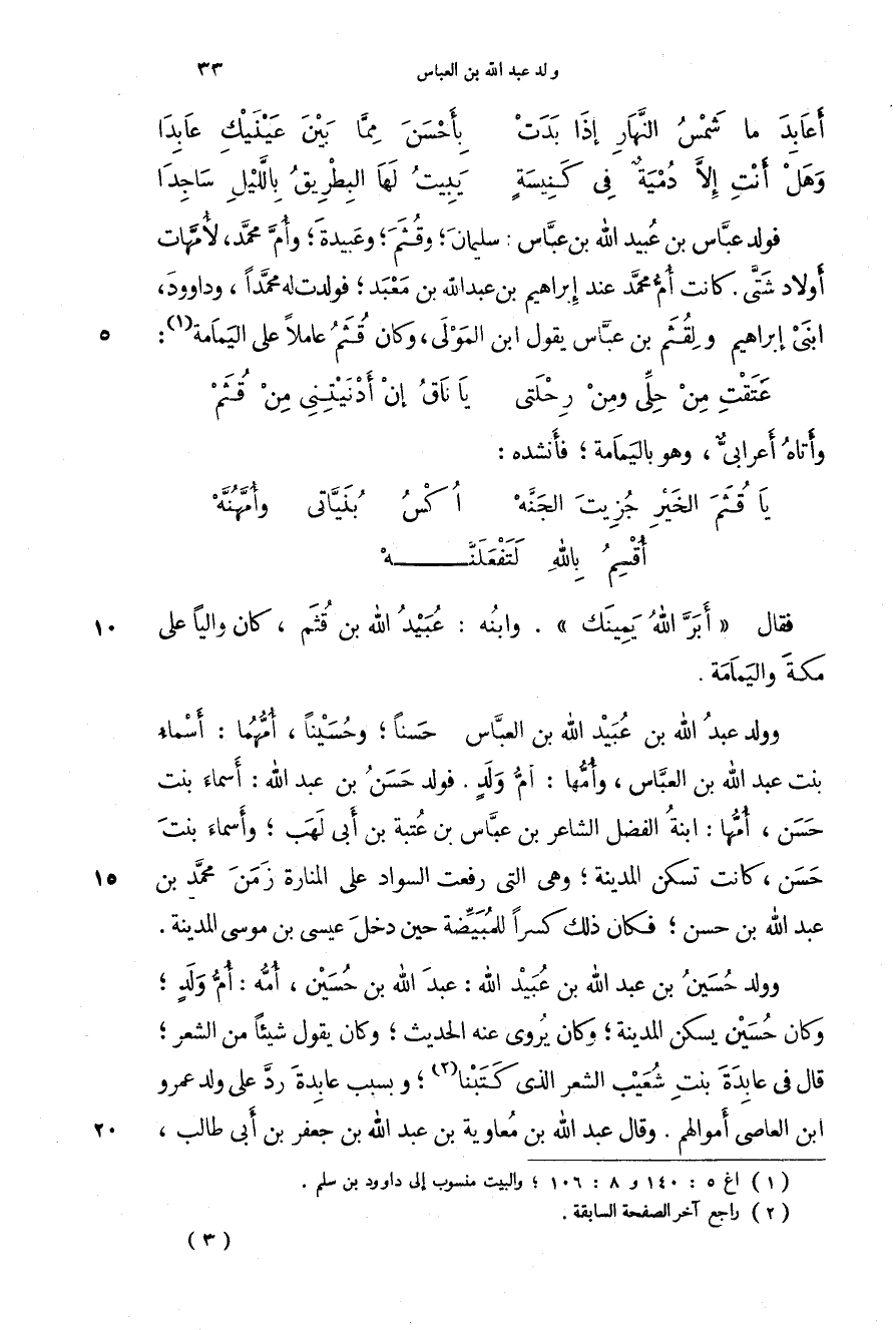 وولد حسين بن عبد الله بن عبيد الله: عبد الله بن حسين، أمه: أم ولد؛ وكان حسين يسكن المدينة؛ وكان يروى عنه الحديث؛ وكان يقول شيئاً من الشعر؛ قال في عابدة بنت شعيب الشعر الذي كتبنا؛ وبسبب عابدة رد على ولد عمرو ابن العاص أموالهم. وقال عبد الله بن معاوية بن عبد الله بن جعفر بن أبي طالب،
