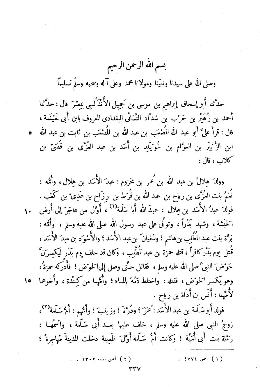 حدثنا أبو إسحاق إبراهيم بن موسى بن جميل الأندلسي بمصر قال: حدثنا أحمد بن زهير بن حرب بن شداد النسائي البغدادي المعروف بابن أبي خيثمة، قال: قرأ علي أبو عبد الله المصعب بن عبد الله بن المصعب بن ثابت بن عبد الله بن الزبير بن العوام بن خويلد بن أسد بن عبد العزى بن قصي بن كلاب، قال: وولد هلال بن عبد الله بن عمر بن مخزوم: عبد الأسد بن هلال، وأمه: نعم بنت العزى بن رياح بن عبد الله بن قرط بن رزاح بن عدي بن كعب.