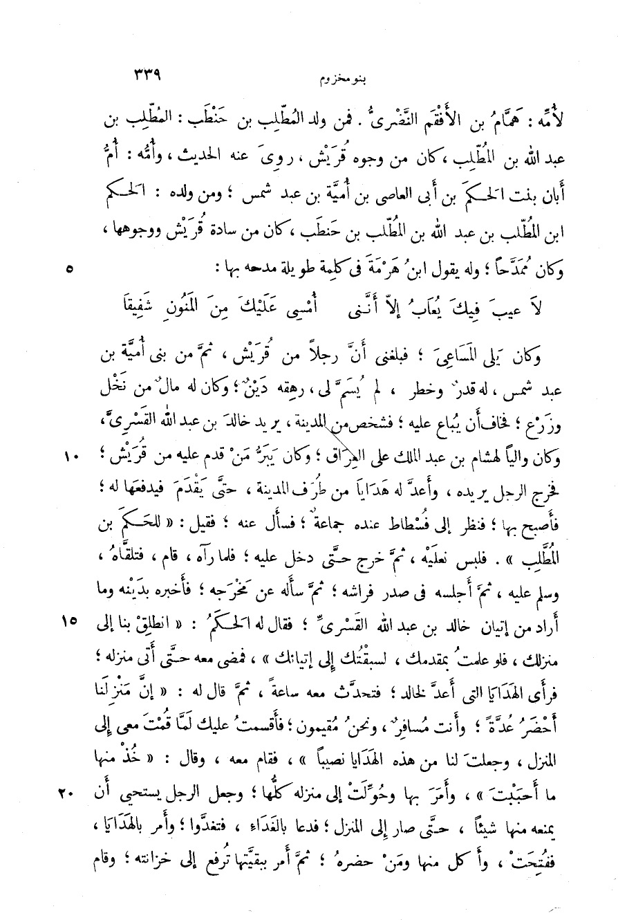 وكان يلي المساعي؛ فبلغني أن رجلاً من قريش، ثم من بني أمية بن عبد شمس، له قدر وخطر، لم يسم لي، رهقه دين؛ وكان له مال من نخل وزرع؛ فخاف أن يباع عليه؛ فشخص من المدينة، يريد خالد بن عبد الله القسري، وكان والياً لهشام بن عبد الملك على العراق؛ وكان يبر من قدم عليه من قريش؛ فخرج الرجل يريده، وأعد له هدايا من طرف المدينة، حتى يقدم فيدفعها له؛ فأصبح بها؛ فنظر إلى فسطاط عنده جماعة؛ فسأل عنه؛ فقيل: " للحكم بن المطلب ". فلبس نعليه، ثم خرج حتى دخل عليه؛ فلما رآه، قام، فتلقاه، وسلم عليه، ثم أجلسه في صدر فراشه؛ ثم سأله عن مخرجه؛ فأخبره بدينه وما أراد من إتيان خالد بن عبد الله القسري؛ فقال له الحكم: " انظلق بنا إلى منزلك، فلو علمت بمقدمك، لسبقتك إلى إتيانك "، فمضى معه حتى أتى منزله؛ فرأى الهدايا التي أعد لخالد؛ فتحدث معه ساعة، ثم قال له: " إن منزلنا أحضر عدة؛ وأنت مسافر، ونحن مقيمون؛ فأقسمت عليك لما قمت معي إلى المنزل، وجعلت لنا من هذه الهدايا نصيباً "، فقام معه، وقال: " خذ منها ما أحببت "، وأمر بها وحولت إلى منزله كلها؛ وجعل الرجل يستحي أن يمنعه منها شيئاً، حتى صار إلى المنزل؛ فدعا بالغداء، فتغدوا؛ وأمر بالهدايا، ففتحت، وأكل منها ومن حضره؛ ثم أمر ببقيتها ترفع إلى خزانته؛ وقام