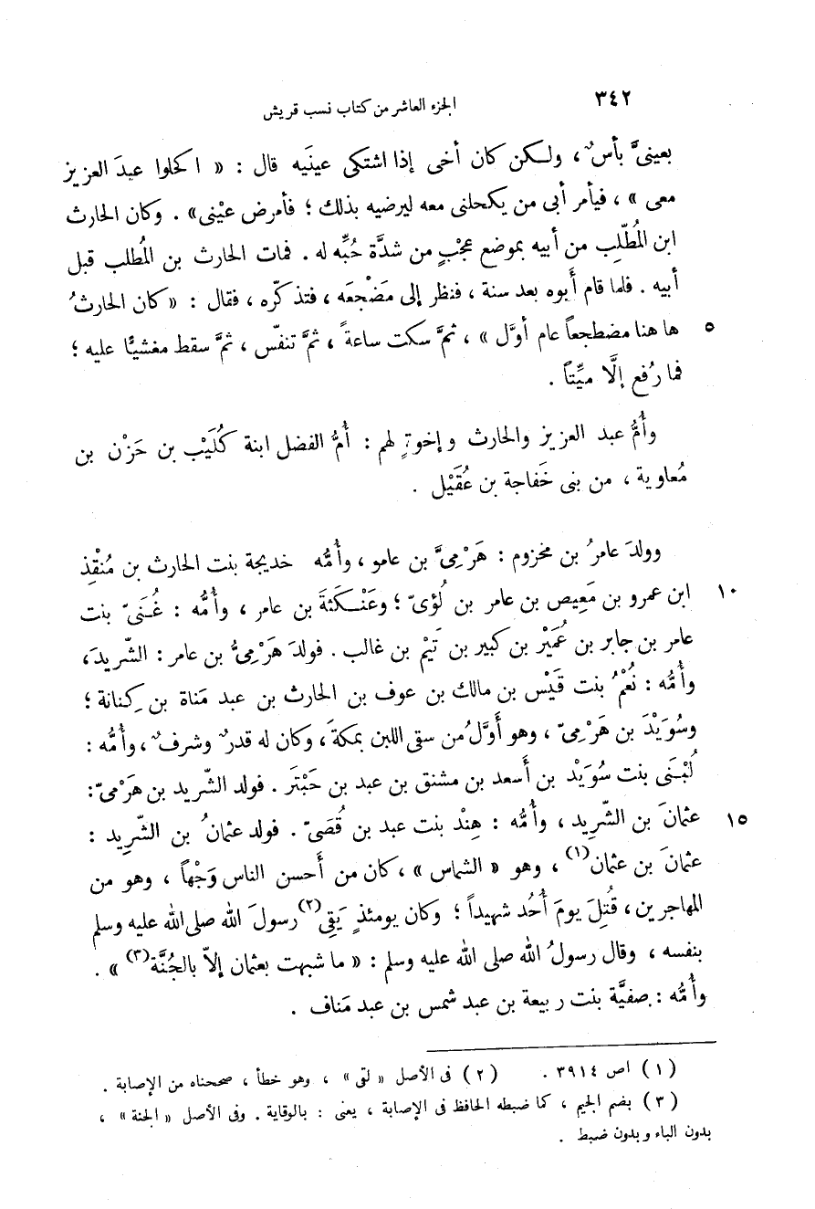 بعيني بأس، ولكن كان أخي إذا اشتكى عينيه قال: " اكحلوا عبد العزيز معي "، فيأمر أبي من يكحلني معه ليرضيه بذلك؛ فأمرض عيني ". وكان الحارث بن المطلب من أبيه بموضع عجب من شدة حبه له. فمات الحارث بن المطلب قبل أبيه. فلما قام أبوه بعد سنة، فنظر إلى مضجعه، فتذكره، فقال: " كان الحارث ها هنا مضطجعاً عام أول "، ثم سكت ساعة، ثم تنفس، ثم سقط مغشياً عليه؛ فما رفع إلا ميتاً.