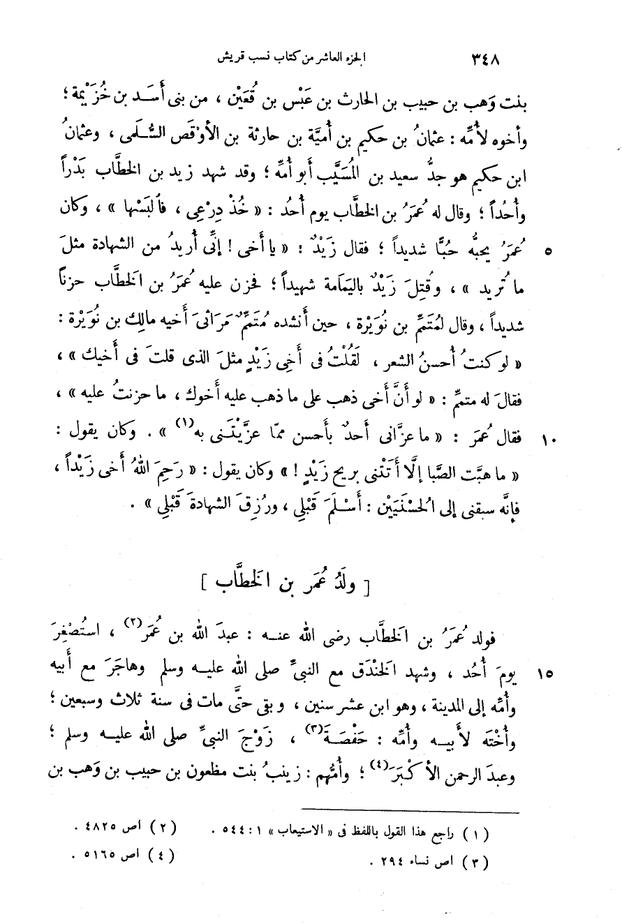 فولد عمر بن الخطاب رضي الله عنه: عبد الله بن عمر، استصغر يوم أحد، وشهد الخندق مع النبي صَلَّى اللهُ عَلَيْهِ وَسَلَّمَ وهاجر مع أبيه وأمه إلى المدينة، وهو ابن عشر سنين، وبقي حتى مات في سنة ثلاث وسبعين؛ وأخته لأبيه وأمه: حفصة، زوج النبي صَلَّى اللهُ عَلَيْهِ وَسَلَّمَ؛ وعبد الرحمن الأكبر؛ وأمهم: زينب بنت مظعون بن حبيب بن وهب بن