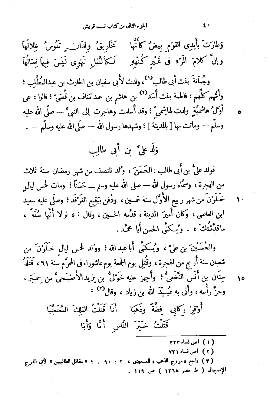 والحسين بن علي، ويكنى أبا عبد الله؛ وولد لخمس لخمس ليال خلون من شعبان سنة أربع من الهجرة، وقتل يوم الجمعة يوم عاشوراء في المحرم سنة 61، قتله سنان بن أنس النخعي؛ وأجهز عليه خولي بن يزبد الأصبحي من حمير، وحز رأسه، وأتى به عبيد الله بن زياد، وقال: