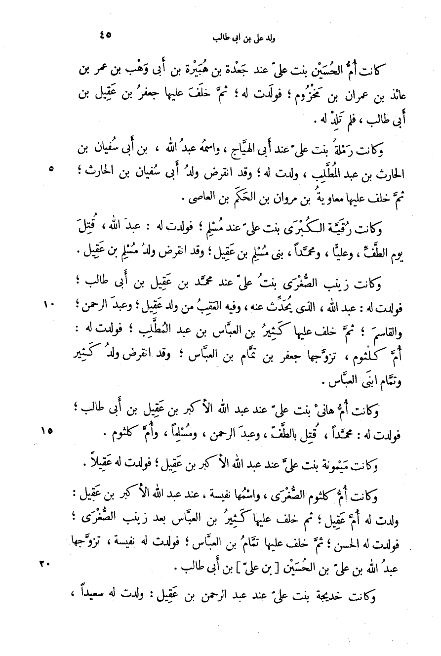 وكانت أم هاني بنت علي عند عبد الله الأكبر بن عقيل بن أبي طالب؛ فولدت له: محمداً، قتل بالطف، وعبد الرحمن، ومسلماً، وأم كلثوم.