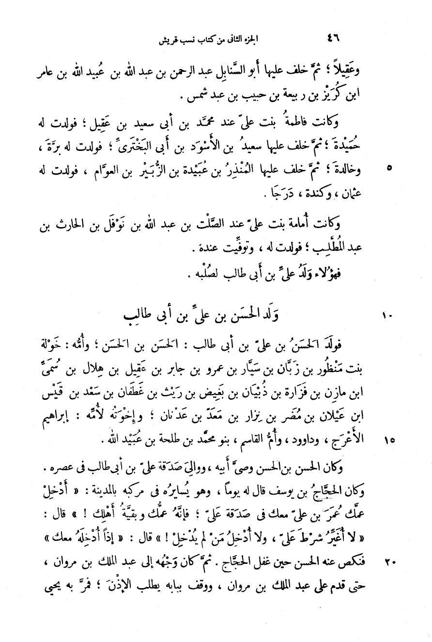 فولد الحسن بن علي بن أبي طالب: الحسن بن الحسن؛ وأمه: خوالة بنت منظور بن زبان بن سيار بن عمرو بن جابر بن عقيل بن هلال بن سمي بن مازن بن فزارة بن ذبيان بن بغيض ابن ريث بن غطفان بن سعد بن قيس بن عيلان بن مضر بن نزار بن معد بن عدنان؛ وإخوته لأمه: إبراهيم الأعرج، وداوود، وأم القاسم، بنو محمد بن طلحة بن عبيد الله.