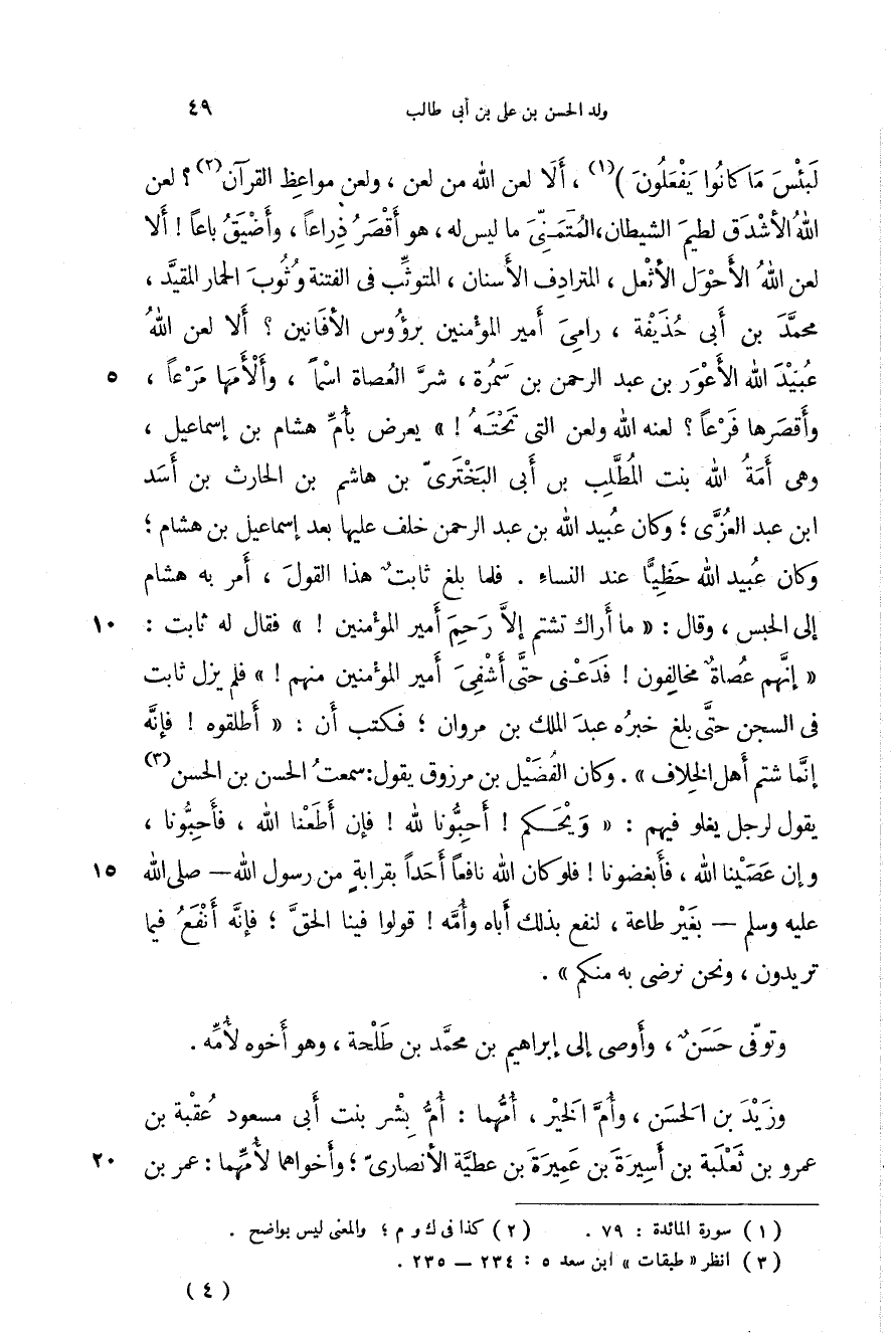 لبئس ما كانوا يفعلون، ألا لعن الله من لعن، ولعن مواعظ القرآن؟ لعن الله الأشدق لطيم الشيطان، المتمني ما ليس له، هو أقصر ذراعاً، وأضيق باعاً! ألا لعن الله الأحول الأثعل، المترادف الأسنان، المتوثب في الفتنة وثوب الحمار المقيد، محمد بن أبي حذيفة، رامي أمير المؤمنين برؤوس الأفانين؟ ألا لعن الله عبيد الله الأعور بن عبد الرحمن بن سمرة، شر العصاة اسماً، وألأمها مرعاً، وأقصرها فرعاً؟ لعنه الله ولعن التي تحته! " يعرض بأم هشام بن إسماعيل، وهي أمة الله بنت المطلب بن أبي البختري بن هاشم بن الحارث بن أسد بن عبد العزى؛ وكان عبيد الله بن عبد الرحمن خلف عليها بعد إسماعيل بن هشام؛ وكان عبيد الله حظياً عند النساء. فلما بلغ ثابت هذا القول، أمر به هشام إلى الحبس، وقال: " ما أراك تشتم إلا رحم أمير المؤمنين! " فقال له ثابت: " إنهم عصاة مخالفون! فدعني حتى أشفي أمير المؤمنين منهم! " فلم يزل ثابت في السجن حتى بلغ خبره عبد الملك بن مروان؛ فكتب أن: " أطلقوه! فإنه إنما شتم أهل الخلاف ". وكان الفضيل بن مرزوق يقول: سمعت الحسن بن الحسن قول لرجل يغلو فهم: " ويحكم! أحبونا لله! فإن أطعنا الله، فأحبونا، وإن عصينا الله، فأبغضونا! فلو كان الله نافعاً أحداً بقرابة من رسول الله - صَلَّى اللهُ عَلَيْهِ وَسَلَّمَ - بغير طاعة، لنفع بذلك أباه وأمه! قولوا فينا الحق؛ فإنه أنفع فيما تريدون، ونحن نرضى به منكم ". وتوفى حسن وأوصى إلى إبراهيم بن محمد بن طلحة، وهو أخوه لأمه، وزيد بن الحسن، وأم الخير، أمهما: أم بشر بنت أبي مسعود عقبة بن عمرو بن ثعلبة بن أسيرة بن عميرة بن عطة الأنصاري؛ وأخواهما لأمهما: عمر بن