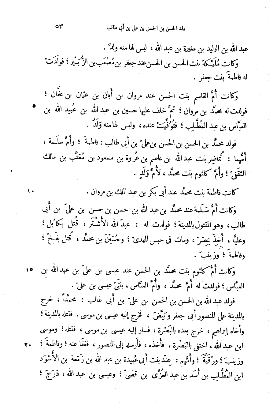 فولد عبد الله بن الحسن بن الحسن بن علي بن أبي طالب: محمداً، خرج بالمدينة على المنصور أبي جعفر وبيض، فخرج إليه عيسى بن موسى. فقتله بالمدينة؛ وأخاه إبراهيم، خرج بعده بالبصرة، فسار إليه عيسى بن موسى، فقتله؛ وموسى ابن عبد الله، اختفى بالبصرة، فأخذه، فأرسله إلى المنصور، فعفا عنه؛ وفاطمة؛ وزينب؛ ورقية؛ وأمهم: هند بنت أبي عبيدة بن عبد الله بن زمعة بن الأسود ابن المطلب بن أسد بن عبد العزى بن قصي؛ وعيسى بن عبد الله، درج؛