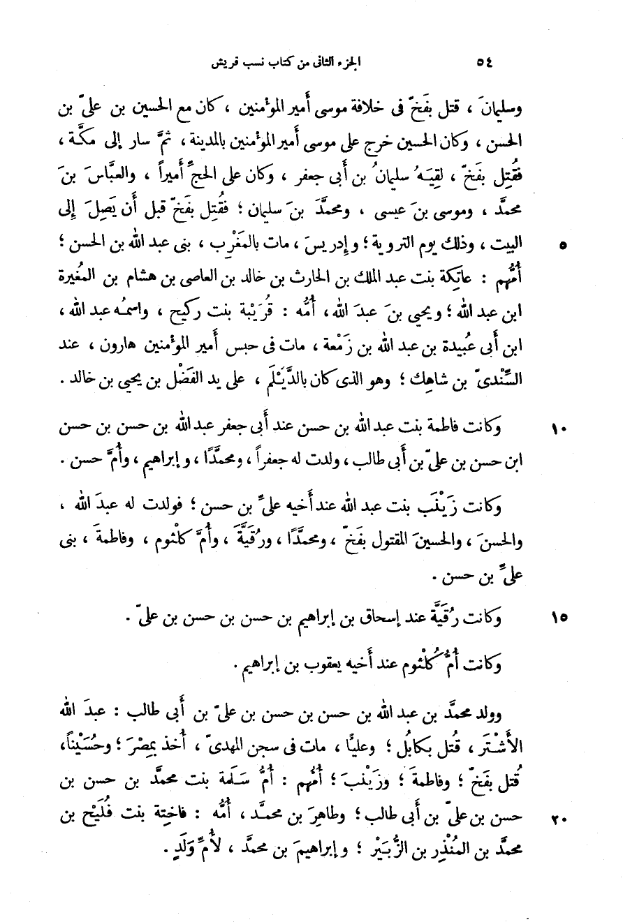 وسليمان، قتل بفخ في خلافة موسى أمير المؤمنين، كان مع الحسين بن علي بن الحسن، وكان الحسين خرج على موسى أمير المؤمنين بالمدينة، ثم سار إلى مكة، فقتل بفخ، لقيه سليمان بن أبي جعفر، وكان على الحج أميراً، والعباس بن محمد، وموسى بن عيسى، ومحمد بن سليمان؛ فقتل بفخ قبل أن يصل إلى البيت، وذلك يوم التروية؛ وإدريس، مات بالمغرب، بني عبد الله بن الحسن؛ أمهم: عاتكة بنت عبد الملك بن الحارث بن خالد بن العاصي بن هشام بن المغيرة ابن عبد الله؛ ويحيى بن عبد الله، أمه: قريبة بنت ركيح، واسمه عبد الله، ابن أبي عبيدة بن عبد الله بن زمعة، مات في حبس أمير المؤمنين هارون، عند السندي بن شاهك؛ وهو الذي كان بالديلم، على يد الفضل بن يحيى بن خالد.
