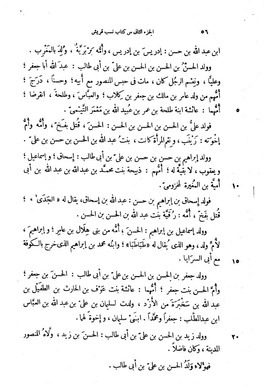 بن عبد الله بن حسن: إدريس بن إدريس، وأمه بربرية، ولد بالمغرب. وولد الحسن بن الحسن بن الحسن بن علي بن أبي طالب: عبد الله أبا جعفر؛ وعلياً، ونعم الرجل كان، مات في حبس المنصور مع أبيه؛ وحسناً، درج؛ أمهم من ولد عامر بن مالك بن جعفر بن كلاب؛ والعباس، وطلحة، انقرضا؛ أمهما: عائشة ابنة طلحة بن عمر بن عبيد الله بن معمر التيمي.