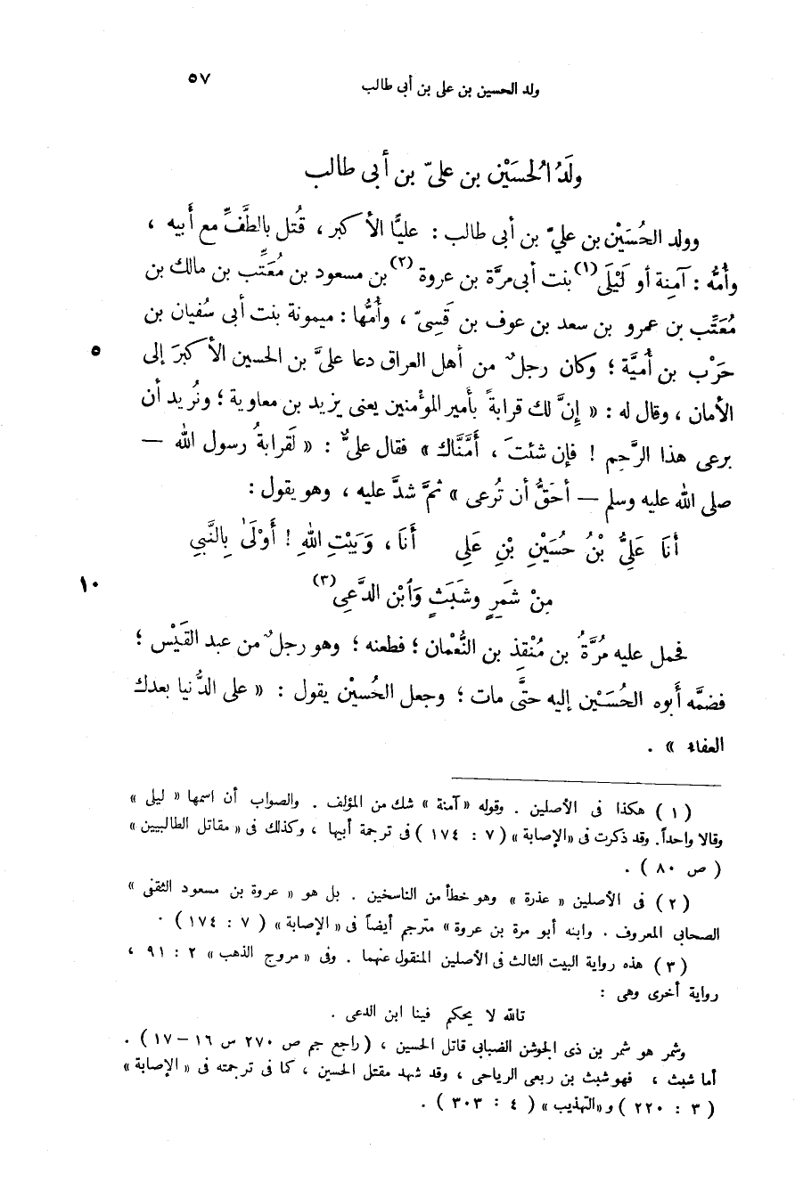 وولد الحسين بن علي بن أبي طالب: علياً الأكبرن قتل بالطف مع أبيه، وأمه: آمنة أو ليلى بنت أبي مرة بن عروة بن مسعود بن معتب بن مالك بن معتب بن عمرو بن سعد بن قسي، وأمها: ميمونة بنت أبي سفيان بن حرب بن أمية؛ وكان رجل من أهل العراق دعا علي بن الحسين الأكبر إلى الأمان، وقال له: " إن لك قرابة بأمير المؤمنين يعني يزيد بن معاوية؛ ونريد أن يرى هذا الرحم فإن شئت، أمناك " فقال علي: " لقرابة رسول الله - صَلَّى اللهُ عَلَيْهِ وَسَلَّمَ - أحق أن ترعى " ثم شد عليه، وهو يقول: