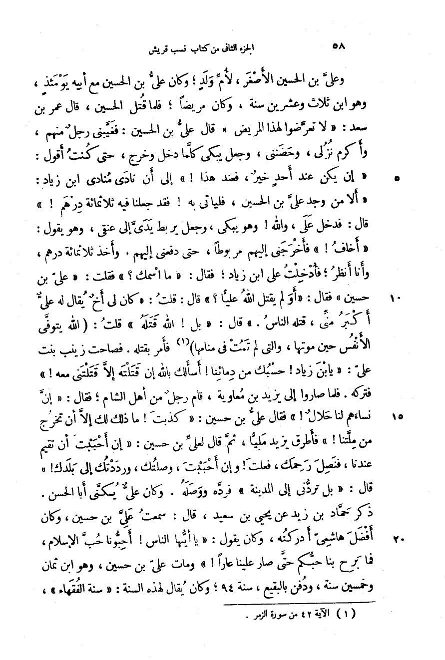 وعلي بن الحسين الأصغر، لأم ولد؛ وكان علي بن الحسين مع أبيه يومئذ، وهو ابن ثلاث وعشرين سنة، وكان مريضاً؛ فلما قتل الحسين، قال عمر بن سعد: " لا تعرضوا لهذا المريض " قال علي بن الحسين: فغيبني رجل منهم، وأكرم نزلي، وحضنني، ووجعل يبكي كلما دخل وخرج، حتى كنت أقول: " إن يكن عند أحد خير، فعند هذا! " إلى أن نادى منادي ابن زياد: " ألا من وجد علي بن الحسين، فلياتي به! فقد جعلنا فيه ثلاثمائة درهم! " قال: فدخل علي، والله! وهو يبكي، وجعل يربط يدي إلى عنقي، وهو يقول: " أخاف! " فأخرجني إليهم مربوطاً، حتى دفعني إليهم، وأخذ ثلاثمائة درهم، وأنا أنظر؛ فأدخلت علي ابن زياد؛ فقال: " ما اسمك؟ " فقلت: " علي بن حسين " فقال: " أولم يقتل الله علياً؟ " قال: قلت: " كان لي أخ يقال له علي أكبر مني، قتله الناس. " قال: " بل! الله قتله " قلت: " الله يتوفى الأنفس حين موتها، والتي لم تمت في منامها " فأمر بقتله. فصاحت زينب بنت علي: " يابن زياد! حسبك من دمائنا! أسألك بالله إن قتلته إلا قتلتني معه! " فتركه. فلما صاروا إلى يزيد بن معاوية، قام رجل من أهل الشام؛ فقال: " إن نساءهم لنا حلال! " فقال علي بن حسين: " كذبت! ما ذلك لك إلا أن تخرج من ملتنا! " فأطرق يزيد ملياً، ثم قال لعلي بن حسين: " إن أحببت أن تقيم عندنا، فنصل رحمك، فعلت! وإن أحببت، وصلتك، ورددتك إلى بلدك! " قال: " بل تردني إلى المدينة " فرده ووصله. وكان علي يكنى أبا الحسن. ذكر حماد بن زيد عن يحيى بن سعيد، قال: سمعت علي بن حسين، وكان أفضل هاشمي أدركته، وكان يقول: " يا أيها الناس! أحبونا حب الإسلام، فما برح بنا حبكم حتى صار علينا عاراً! " ومات علي بن حسين، وهو ابن ثمان وخمسين سنة، ودفن بالبقيع، سنة 94؛ وكان يقال لهذه السنة: " سنة الفقهاء "،