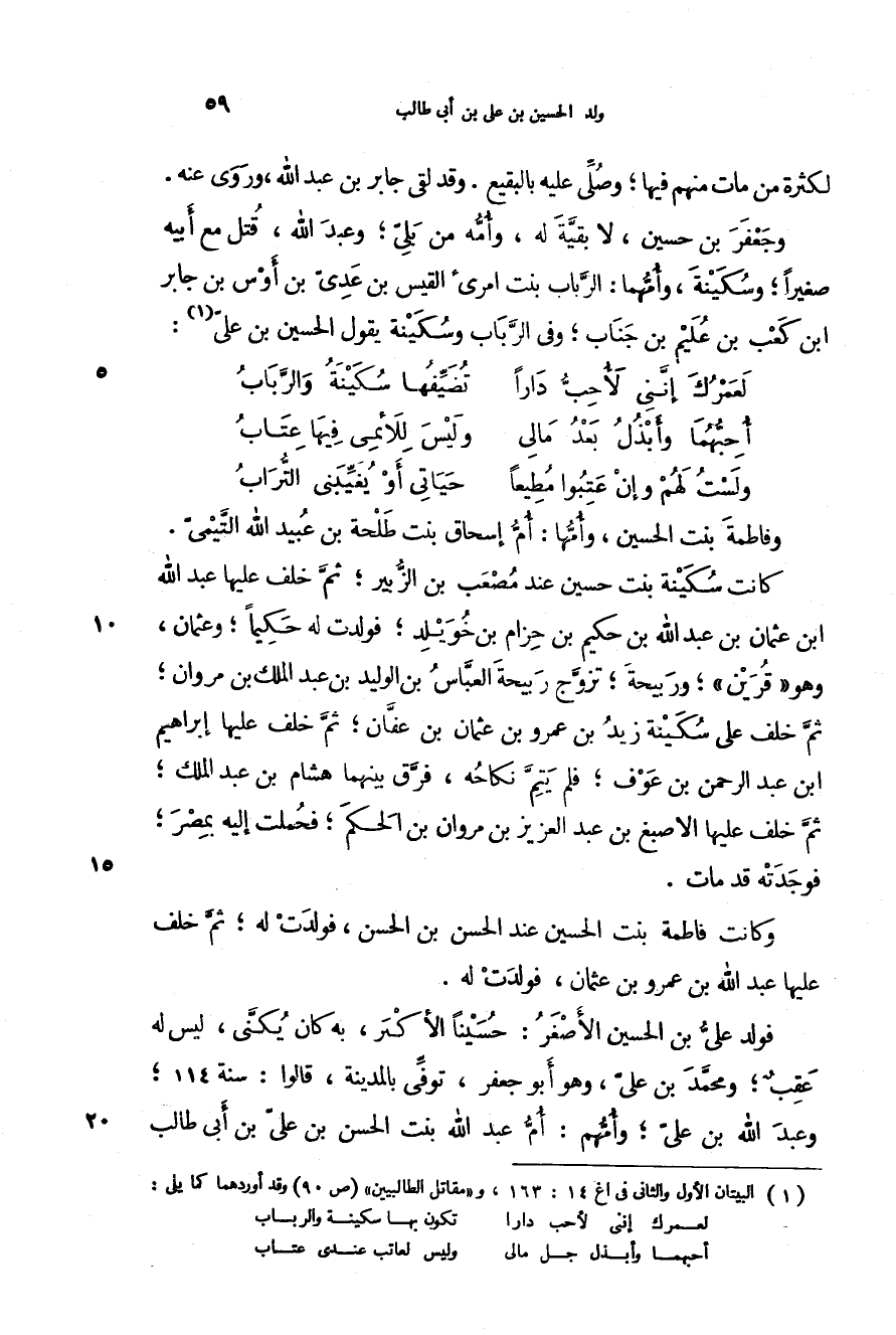 وجعفر بن حسين، لا بقية له، وأمه من بلي، وعبد الله، قتل مع أبيه صغيراً؛ وسكينة، وأمهما: الرباب بنت امرئ القيس بن عدي بن أوس بن جابر بن كعب بن عليم بن جناب؛ وفي الرباب وسكينة يقول الحسين بن علي: