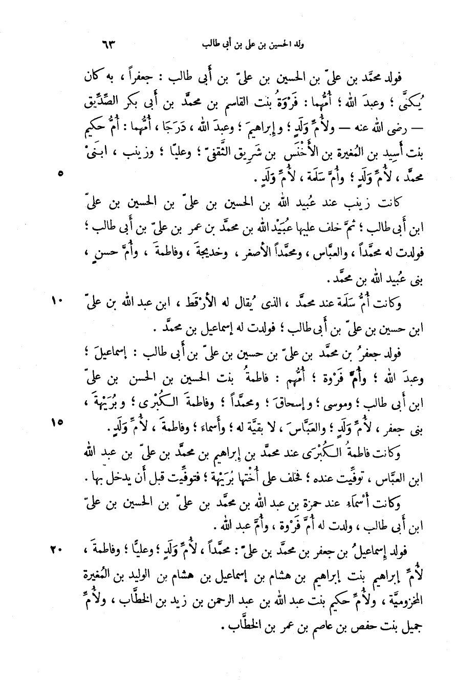 فولد جعفر بن محمد بن علي بن حسين بن علي بن أبي طالب؛ إسماعيل؛ وعبد الله؛ وأم فروة؛ أمهم: فاطمة بنت الحسين بن الحسن بن علي بن أبي طالب؛ وموسى؛ وإسحاق؛ ومحمداً؛ وفاطمة الكبرى؛ وبريهة، بني جعفر، لأم ولد؛ والعباس، لا بقية له؛ وأسماء؛ وفاطمة، لأم ولد.