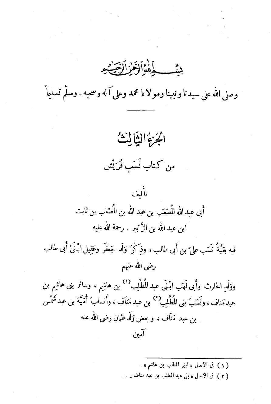 وولد الحارث وأبي لهب ابني عبد المطلب بن هاشم، وسائر بني هاشم بن عبد مناف، ونسب بني المطلب بن عبد مناف، وأنساب أمية بن عبد شمس بن عبد مناف، وبعض ولد عثمان رضي الله عنه آمين