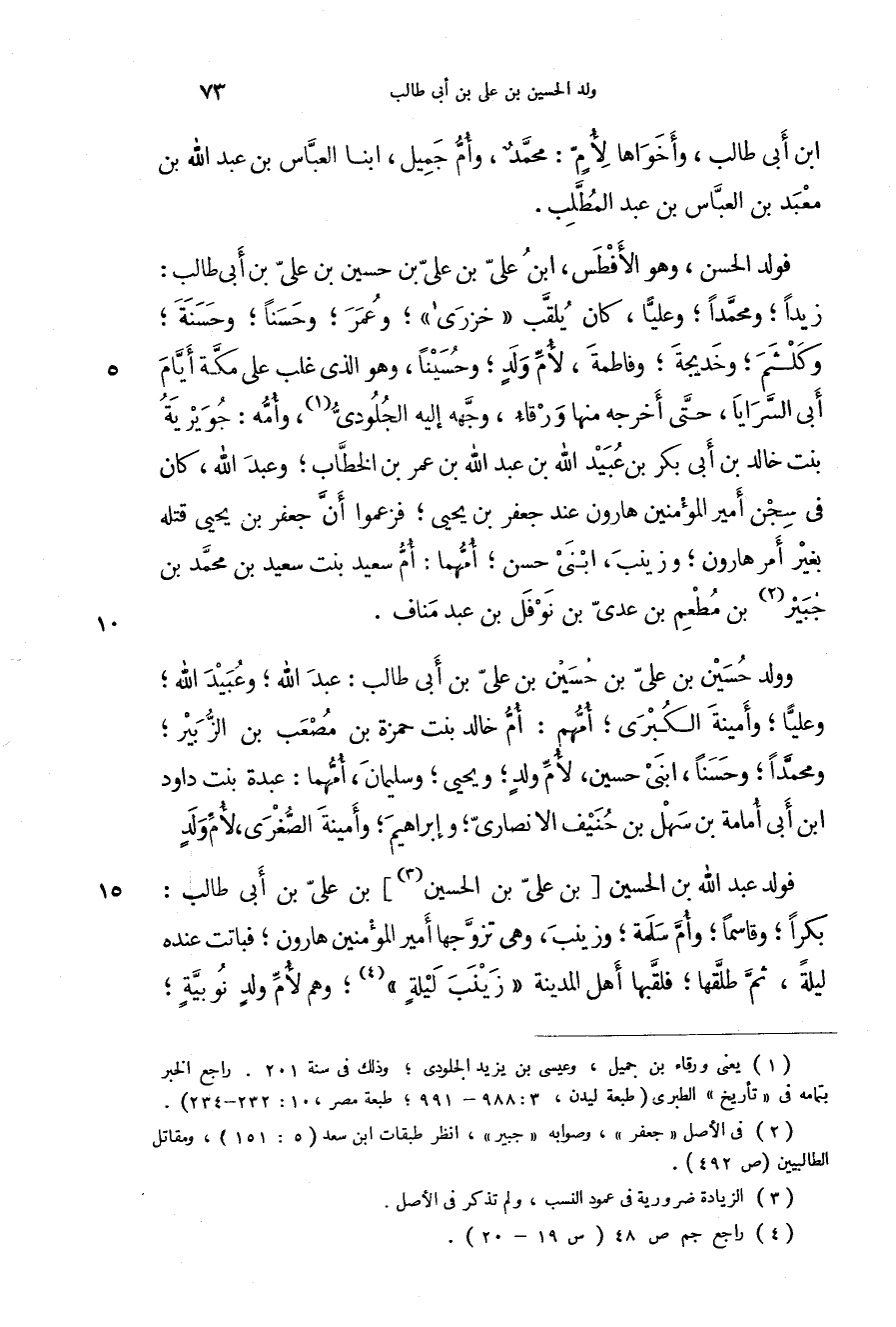 فولد الحسن، وهو الأفطس، ابن علي بن علي بن حسين بن علي بن أبي طالب: زيداً؛ ومحمداً؛ وعلياً، كان يلقب " خزرى "؛ وعمر؛ وحسناً؛ وحسنة؛ وكلثم: وخديجة؛ وفاطمة، لأم ولد؛ وحسيناً، وهو الذي غلب على مكة أيام أبي السرايا، حتى أخرجه منها ورقاء، وجهه إليه الجلودي، وأمه: جويرية بنت خالد بن أبي بكر بن عبيد الله بن عبد الله بن عمر بن الخطاب؛ وعبد الله، كان في سجن أمير المؤمنين هارون عند جعفر بن يحيى؛ فزعموا أن جعفر بن يحيى قتله بغير أمر هارون؛ وزينب، ابني حسن؛ أمهما: أم سعيد بنت سعيد بن محمد بن جبير بن مطعم بن عدي بن نوفل بن عبد مناف.