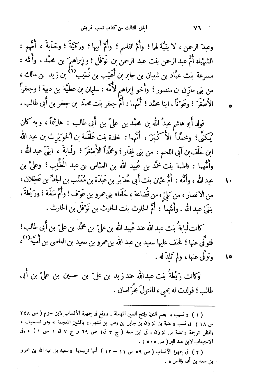 وعبد الرحمن، لا بقية لهما؛ وأم القاسم؛ وأم أبيها؛ ورقية؛ وحبابة، أمهم: الشهباء أم عبد الرحمن بن نوفل؛ وإبراهيم بن محمد، وأمه: مسرعة بنت عباد بن شيبان بن جابر بن أهيب بن نسيب بن زيد بن مالك، من بني مازن بن منصور؛ وأخو إبراهيم لأمه: سليمان بن عطية بن دبية؛ وجعفراً الأصغر؛ وعوناً، ابنا محمد؛ أمهما: أم جعفر بنت محمد بن جعفر بن أبي طالب.