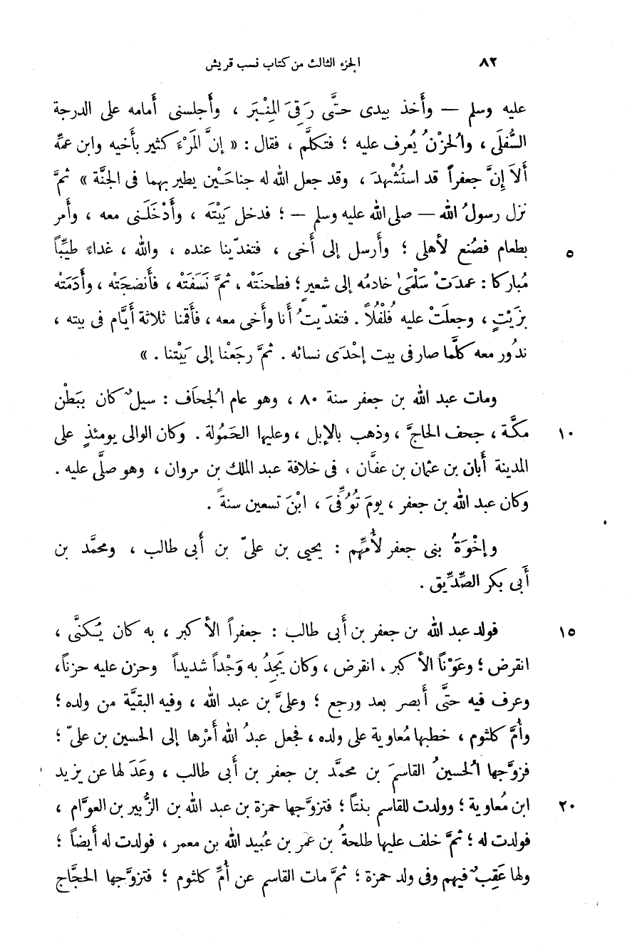 عليه وسلم - وأخذ بيدي حتى رقي المنبر، وأجلسني أمامه على الدرجة السفلى، والحزن يعرف إليه؛ فتكلم، فقال: " إن المرء كثير بأخيه وابن عمه ألا إن جعفراً قد استشهد، وقد جعل الله له جناحين يطير بهما في الجنة " ثم نزل رسول الله - صَلَّى اللهُ عَلَيْهِ وَسَلَّمَ -؛ فدخل بيته، وأدخلني معه، وأمر بطعام فصنع لأهلي، وأرسل إلى أخي، فتغدينا عنده، والله، غداء طيباً مباركاً: عمدت سلمى خادمة إلى شعير؛ فطحنته، ثم نسفته، فأنضجته، وأدمته بزيت، وجعلت عليه فلفلاً. فتغذيت أنا وأخي معه، فأقمنا ثلاثة أيام في بيته، ندور معه كلما صار في بيت إحدى نسائه. ثم رجعنا إلى البيت. " ومات عبد الله بن جعفر سنة 80، وهو عام الجحاف: سيل كان ببطن مكة، جحف الحاج، وذهب بالإبل، وعليها الحمولة. وكان الوالي يومئذ على المدينة أبان بن عثمان بن عفان، في خلافة عبد الملك بن مروان، وهو صلى الله عليه.