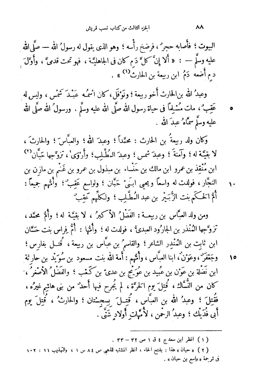 البيوت؛ فأصابه حجر، فرضخ رأسه؛ وهو الذي يقول له رسول الله - صَلَّى اللهُ عَلَيْهِ وَسَلَّمَ -: " ألا إن كل دم في الجاهلية، فهو تحت قدمي، وأول دم أضعه دم ابن ربيعة بن الحارث ".