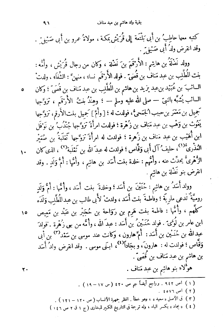 وولد أسد بن هاشم: حنين بن أسد؛ وخلدة بنت أسد، وأمها: أم ولد رومية تدعى مارية؛ وفاطمة بنت أسد، ولدت لأبي طالب بن عبد المطلب ولده كلهم، وأمها: فاطمة بنت هرم بن رواحة بن حجير بن عبد بن معيص بن عامر بن لؤي. فولد حنين بن أسد: عبد الله، وأمه من بني زهرة. فولد عبد الله بن حنين بن أسد: أم هارون وكانت عند موسى بن سعد بن أبي وقاص؛ فولدت له: هارون، وبجاداً، ابني موسى. وقد انقرض ولد أسد بن هاشم بن عبد مناف بن قصي.