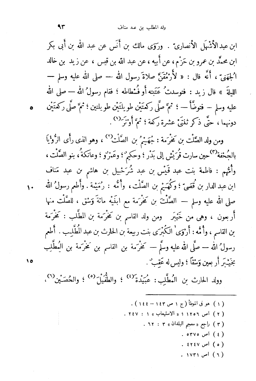 بن عبد الأشهل الأنصاري. وروى مالك بن أنس عن عبد الله بن أبي بكر بن محمد بن عمرو بن حزم، عن أبيه، عن عبد الله بن قيس، عن زيد بن خالد الجهني، أنه قال: " لأرمقن صلاة رسول الله - صَلَّى اللهُ عَلَيْهِ وَسَلَّمَ - الليلة " قال زيد: فتوسدت عتبته أو فسطاطه؛ فقام رسول الله - صَلَّى اللهُ عَلَيْهِ وَسَلَّمَ - فتوضأ -؛ ثم صلى ركعتين طويلتين؛ ثم صلى ركعتين دونهما، حتى ذكر ثنتي عشرة ركعة؛ ثم أوتر.