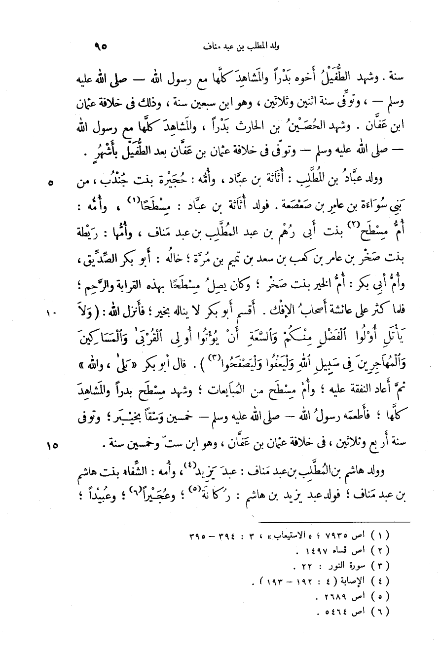 وولد عباد بن المطلب: أثاثه بن عباد، وأمه: حجيرة بنت جندب، من بني سواءة بن عامر بن صعصعة. فولد أثاثة بن عباد: مسطحاً، وأمه: أم سطح بنت أبي رهم بن عبد المطلب بن عبد مناف، وأمها: ريطة بنت صخر بن عامر بن كعب بن سعد بن تميم بن مرة؛ خاله: أبو بكر الصديق، وأم أبي بكر: أم الخير بنت صخر؛ وكان يصل مسطحاً بهذه القرابة والرحم؛ فلما كثر على عائشة أصحاب الإفك. أقسم أبو بكر لا يناله بخير؛ فأنزل الله: " ولا يأتل أولوا الفضل منكم والسعة أن يؤتوا أولي القربى والمساكين والمهاجرين في سبيل الله وليعفوا وليصفحوا ". قال أبو بكر " بلى، والله " ثم عاد النفقة عليه؛ وأم مسطح من المبايعات؛ وشهد مسطح بدراً والمشاهد كلها؛ فأطعمه رسول الله - صَلَّى اللهُ عَلَيْهِ وَسَلَّمَ - خمسين وسقاً بخيبر؛ وتوفي سنة أربع وثلاثين، في خلافة عثمان بن عفان، وهو ابن ست وخمسين سنة.