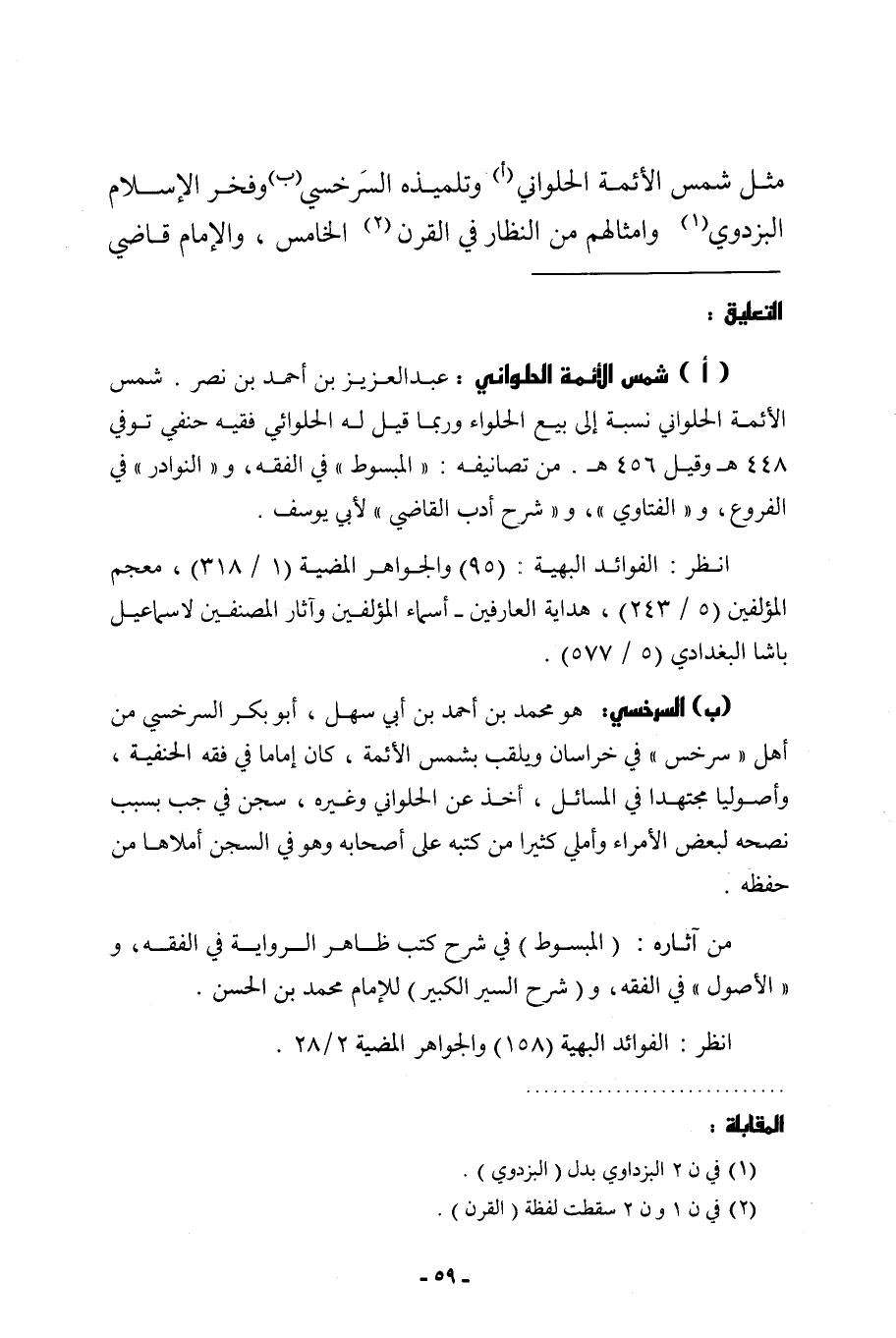 مثل شمس الْأَئِمَّة الْحلْوانِي وتلميذه السَّرخسِيّ وفخر الْإِسْلَام الْبَزْدَوِيّ وامثالهم من النظار فِي الْقرن الْخَامِس وَالْإِمَام قَاضِي