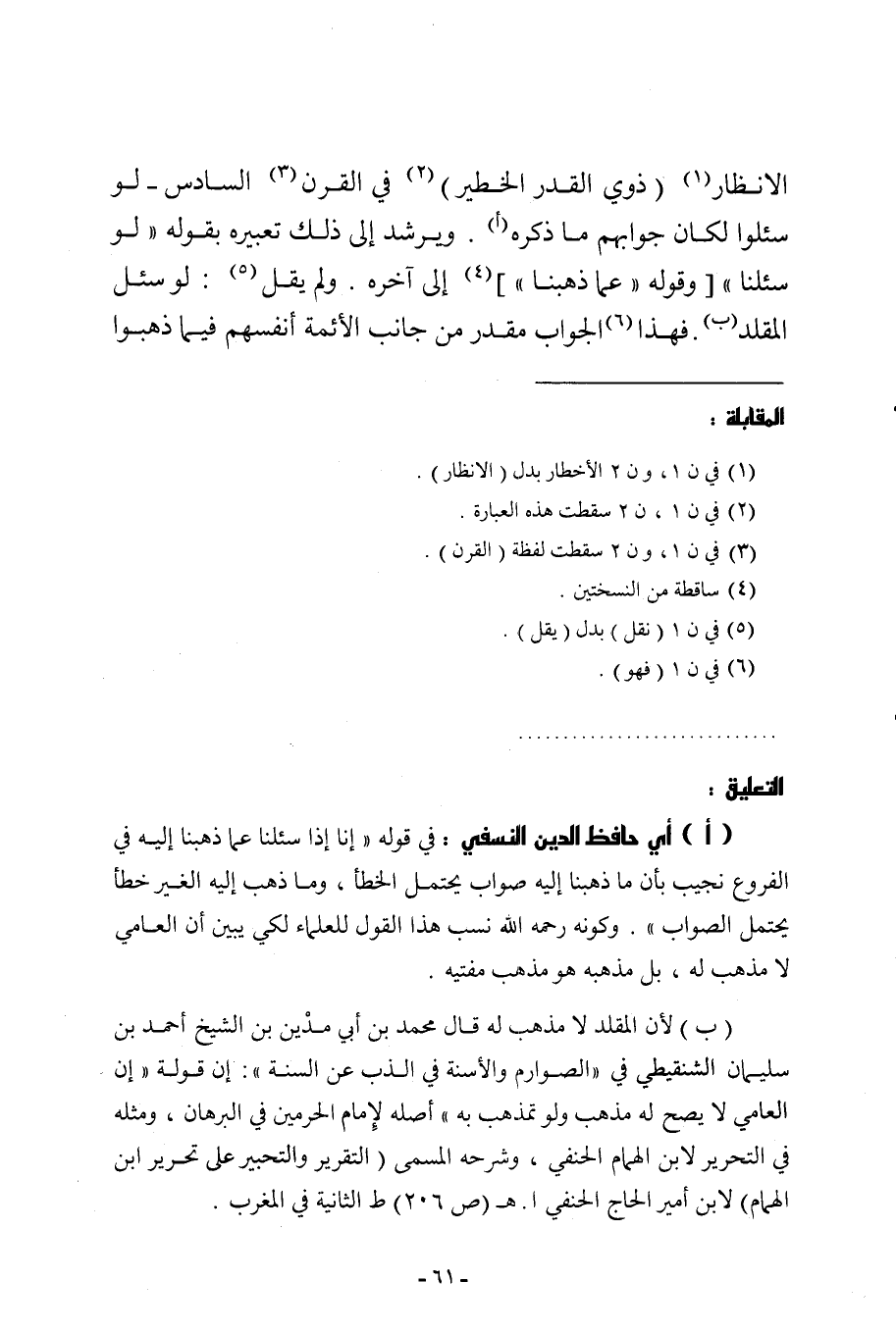 الانظار ذَوي الْقدر الخطير فِي الْقرن السَّادِس لَو سئلوا لَكَانَ جوابهم مَا ذكره ويرشد إِلَى ذَلِك تَعْبِيره بقوله (لَو سئلنا) وَقَوله (عَمَّا ذَهَبْنَا) إِلَى آخِره وَلم يقل لَو سُئِلَ الْمُقَلّد فَهَذَا الْجَواب مُقَدّر من جَانب الْأَئِمَّة أنفسهم فِيمَا ذَهَبُوا
