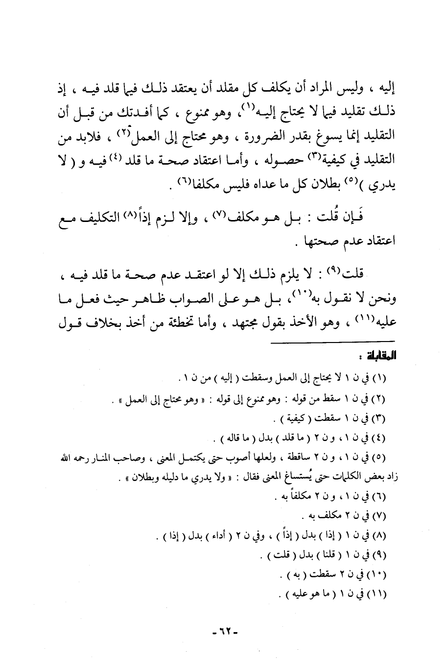 // إِلَيْهِ وَلَيْسَ المُرَاد أَن يُكَلف كل مقلد أَن يعْتَقد ذَلِك فِيمَا قلد فِيهِ إِذْ ذَلِك تَقْلِيد فِيمَا لَا يحْتَاج إِلَيْهِ وَهُوَ مَمْنُوع كَمَا أفدتك من قبل أَن التَّقْلِيد إِنَّمَا يسوغ بِقدر الضَّرُورَة وَهُوَ مُحْتَاج إِلَى الْعَمَل فَلَا بُد من التَّقْلِيد فِي كَيْفيَّة حُصُوله وَأما اعْتِقَاد صِحَة مَا قلد فِيهِ وَلَا يدْرِي بطلَان كل مَا عداهُ فَلَيْسَ مُكَلّفا