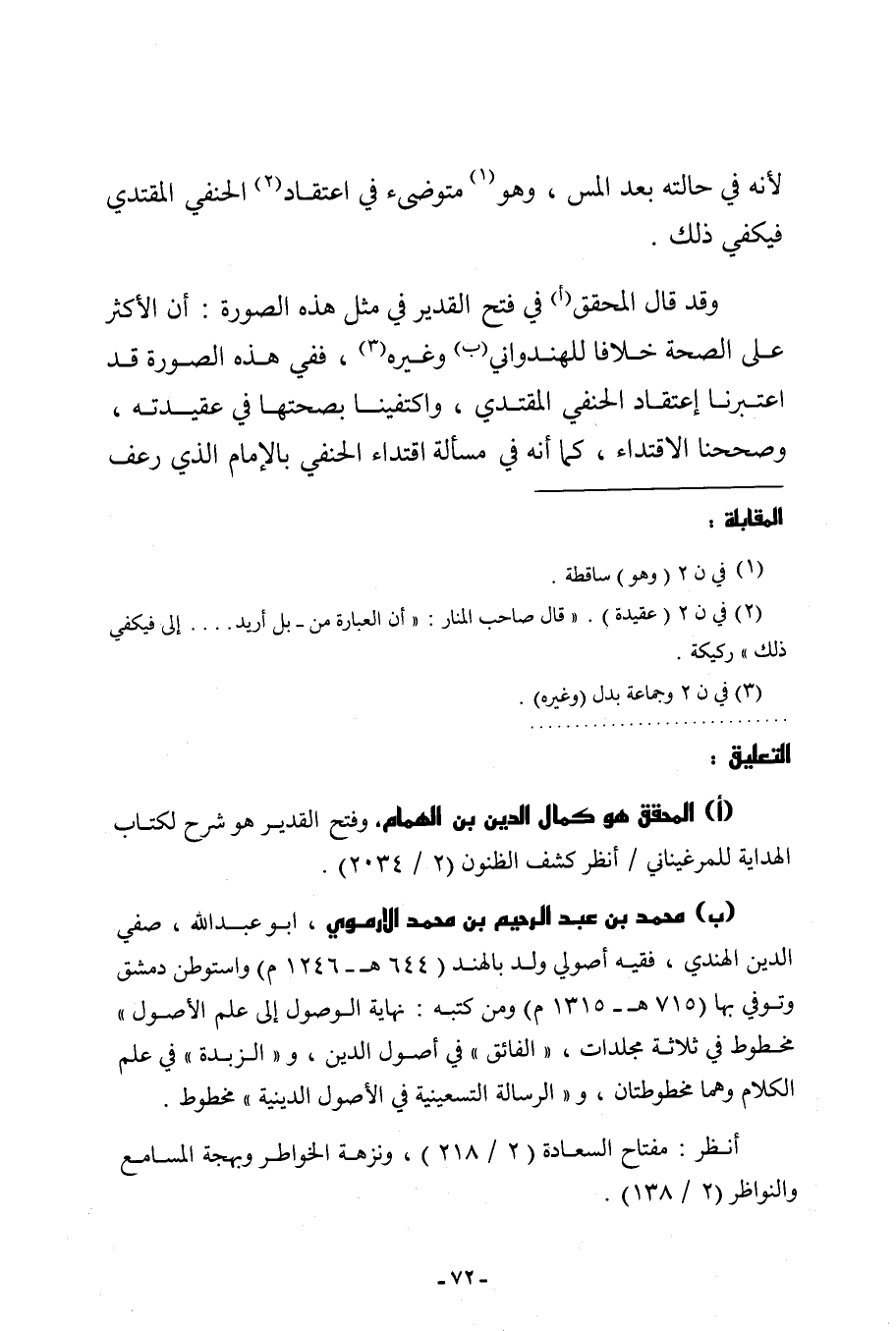 وَقد قَالَ الْمُحَقق فِي فتح الْقَدِير فِي مثل هَذِه الصُّورَة أَن الْأَكْثَر على الصِّحَّة خلافًا للهندواني وَغَيره فَفِي هَذِه الصُّورَة قد اعْتبرنَا إعتقاد الْحَنَفِيّ المقتدى واكتفينا بِصِحَّتِهَا فِي عقيدته وصححنا الِاقْتِدَاء كَمَا أَنه فِي مَسْأَلَة اقْتِدَاء الْحَنَفِيّ بِالْإِمَامِ الَّذِي رعف