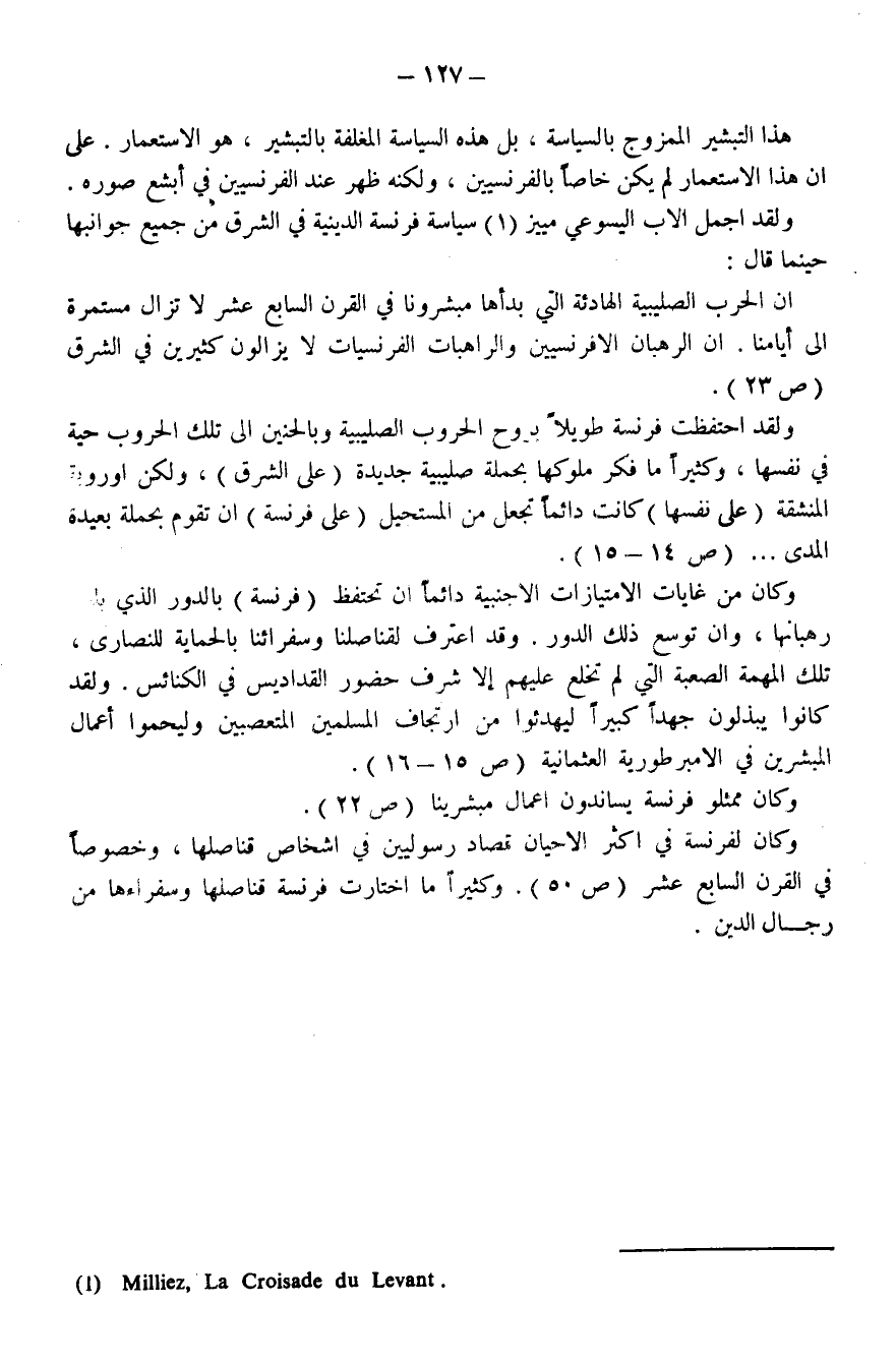 ولقد أجمع الأب اليسوعي (ملييز) (¬1) سياسة فرنسا الدينية في الشرق من جميع جوانبها قال: «إِنَّ الحَرْبَ الصَّلِيبِيَّةَ الهَادِئَةَ التِي بَدَأَهَا مُبَشِّرُونَا فِي القَرْنِ السَّابعِ عَشَرَ لاَ تَزَالُ مُسْتَمِرَّةً إِلَى أَيَامِنَا. إِنَّ الرُّهْبَانَ الفِرَنْسِيِّينَ وَالرَّاهِبَاتِ الفَرَنْسِيَّاتِ لاَ يَزَالُونَ كَثِيرِينِ فِي الشَّرْقِ» (ص 23).