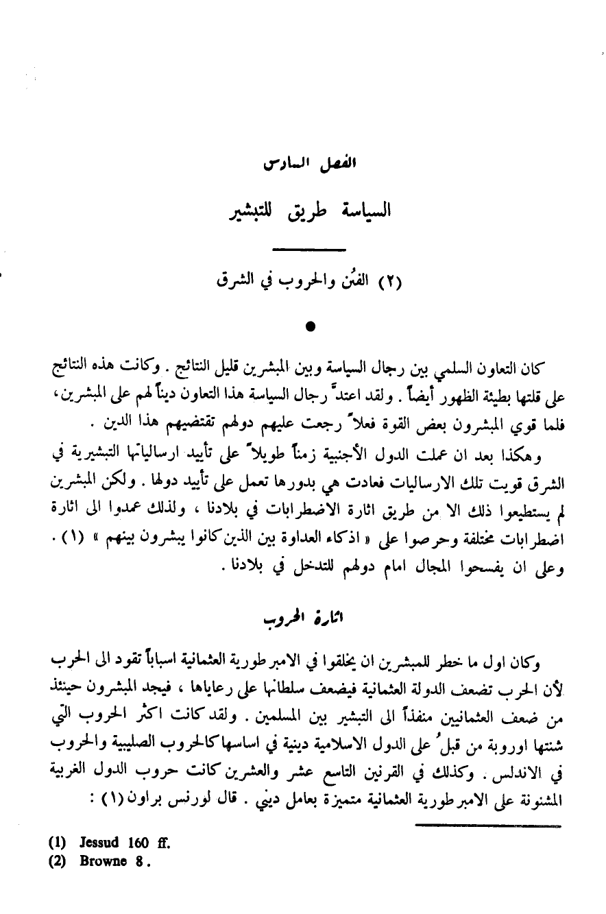 وهكذا بعد أن عملت الدول الأجنبية زمنًا طويلاً على تأييد إرساليتاتها التبشيرية في الشرق قويت تلك الإرساليات فعادت هي بدورها تعمل على تأييد دولها. ولكن المبشرين لم يستطيعوا ذلك إلا من طريق إثارة الاضطرابات في بلادنا، ولذلك عمدوا إلى إثارة اضطرابات مختلفة وحرصوا على «إِذْكَاءِ العَدَاوَةِ بَيْنَ الذِينَ كَانُوا يُبَشِّرُونَ بَيْنَهُمْ» (¬1). وعلى أن يفسحوا المجال أمام دولهم للتدخل في بلادنا.