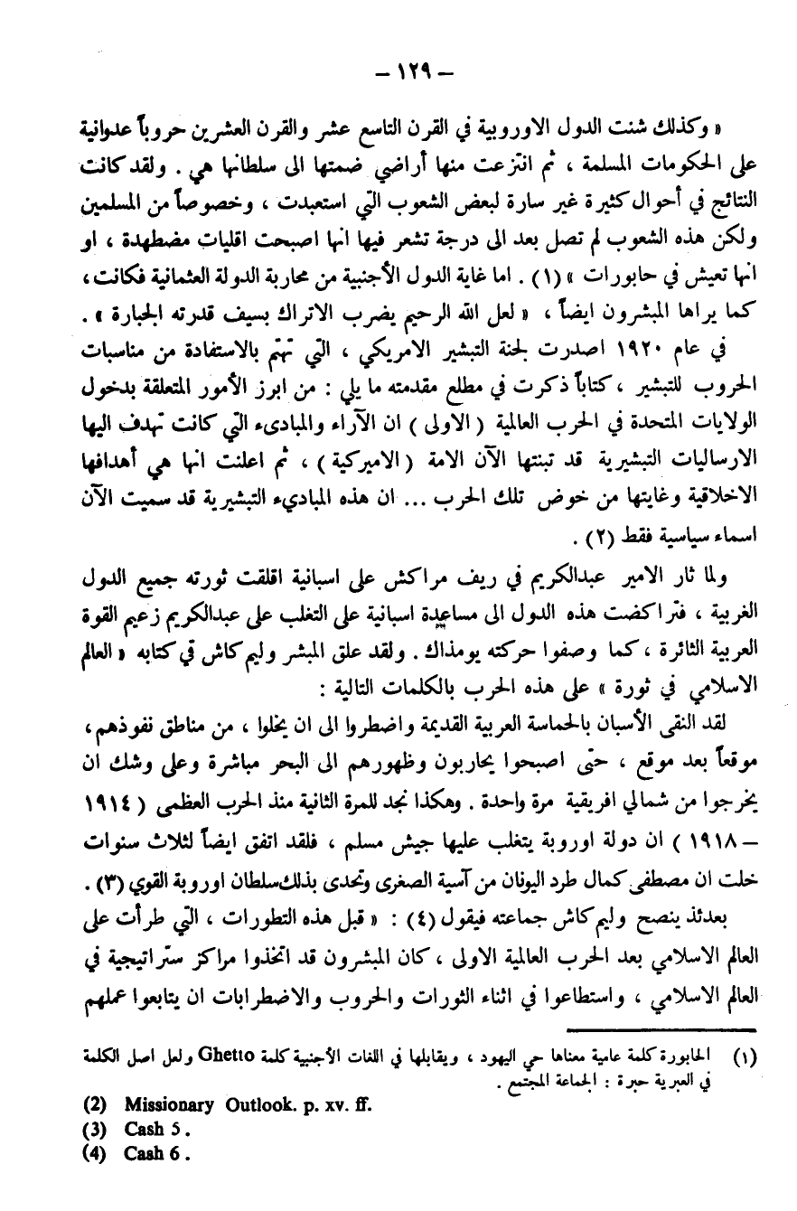 بعدئذٍ ينصح (وليم كاش) جماعته فيقول (¬4): «قَبْلَ هَذِهِ التَّطَوُّرَاتِ، التِي طَرَأَتْ عَلَى العَالَمِ الإِسْلاَمِيِّ بَعْدَ الحَرْبِ العَالَمِيَّةِ الأُولَى، كَانَ المُبَشِّرُونَ قَدْ اِتَّخَذُوا مَرَاكِزَ اِسْتْرَاتِيجِيَّةَ فِي العَالَمِ الإِسْلاَمِيِّ، وَاِسْتَطَاعُوا فِي أَثَناءِ الثَّوْرَاتِ وَالحُروبِ وَالاِضْطِرابَاتِ أَنْ يُتَابِعُوا عَمَلَهُمْ