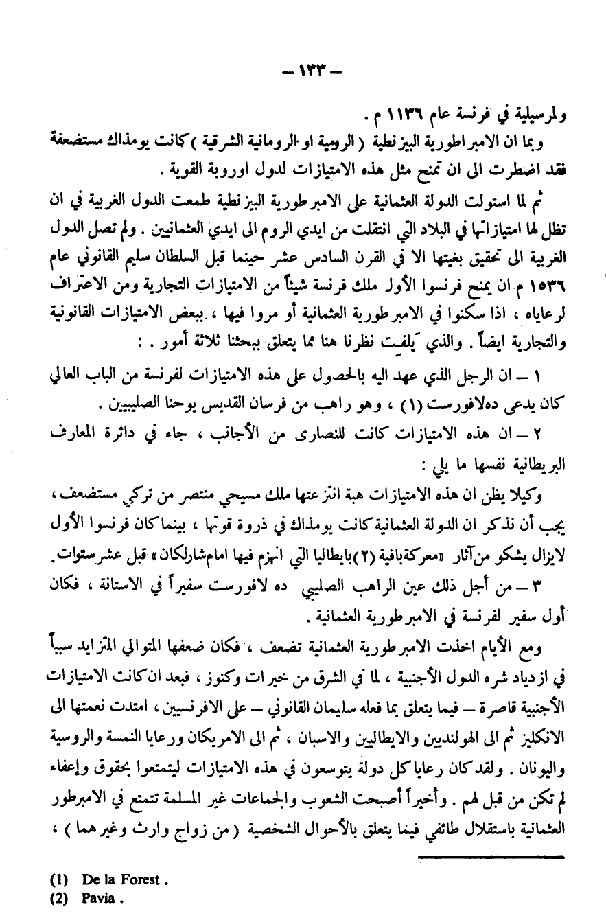 «وَكَيْ لاَ يُظَنَّ أَنَّ هَذِهِ الاِمْتِيازَاتِ هِبَةً [اِنْتَزَعَهَا] مَلِكٌ مَسِيحِيٌّ مُنْتَصِرٌ مِنْ تُرْكِيٍّ مُسْتَضْعَفٍ، يَجِبُ أَنْ نُذَكِّرَ أَنَّ الدَّوْلَةَ العُثْمَانِيَّةَ كَانَتْ يَوْمَذَاكَ فِي ذُرْوَةِ قُوَّتِهَا، بَيْنَمَا كَانَ (فْرُنْسْوَا الأَوَّلْ) لاَ يَزَالُ يَشْكُو مِنْ آثَارِ " مَعْرَكَةِ بَافِيَهْ " (¬2) بِإِيطَالْيَا التِي اِنْهَزَمَ فِيهَا أَمَامَ (شَارْلُكَانْ)» قبل عشر سنوات.