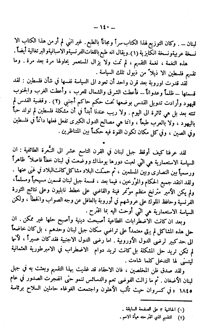 لقد عرفنا كيف أوقظ جبل لبنان في القرن التاسع عشر إلى النعرة الطائفية: إن السياسة الاستعمارية هي التي لعبت دورها يومذاك ووضعت في لبنان خَطًّا فَاصِلاً ظَاهِرًا وَرَسْمِيًّا بَيْنَ النَّصَارَى وَالمُسْلِمِينَ، ثم حملت البلاد مشاكل كانت البلاد في غنى عنها. ولقد انتقد جميع الحكام والمؤرخين، فيما بعد، قسمة جبل لبنان قسمين: مسيحيًا ومسلمًا، ولم يكن الأمير (مترنخ) منظم مؤتمر فْيِينَّا والقاضي على خطط نابليون وعلى نتائج الثورة الفرنسية وحافظ الملوك على عروشهم في أوروبا بالغافل عن وجه الصواب والخطأ، ولكن السياسة الاستعمارية هي التي أوحت إليه بما اقترح.
