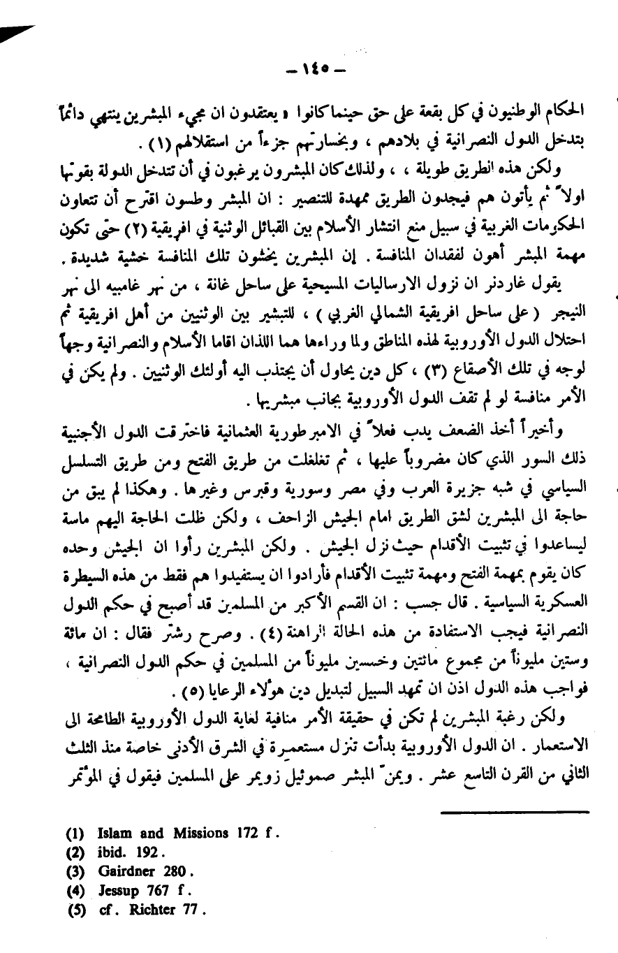 قال (جسب): «إِنَّ القِسْمَ الأَكْبَرَ مِنَ المُسْلِمِينَ قَدْ أَصْبَحَ فِي حُكْمِ الدُّوَلِ النَّصْرَانِيَّةِ فَيَجِبُ الاِسْتِفَادَةَ مِنْ هَذِهِ الحَالَةِ الرَّاهِنَةِ» (¬4). وصرح (رشتر) فقال: «إِنَّ مِائَةَ وَسِتِّينَ مَلْيُونًا مِنْ مَجْمُوعِ مِائَتَيْنِ وَخَمْسِينَ مَلْيُونًا مِنَ المُسْلِمِينَ فِي حُكْمِ الدُّوَلِ النَّصْرَانِيَّةِ، فَوَاجِبُ هَذِهِ الدُّوَلِ إِذَنْ أَنْ تُمَهِّدَ السَّبِيلَ لِتَبْدِيلِ دِينِ هَؤُلاَءِ الرَّعَايَا» (¬5).